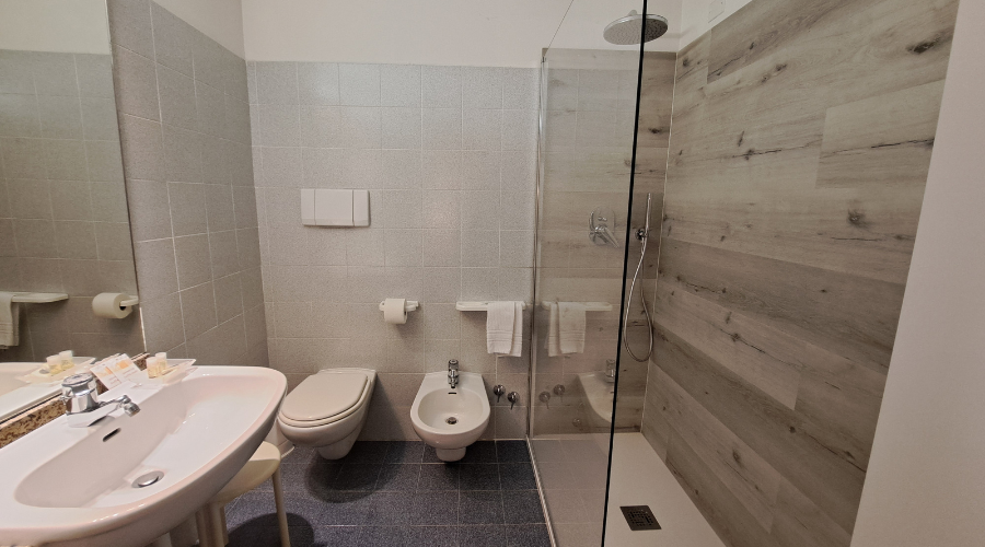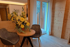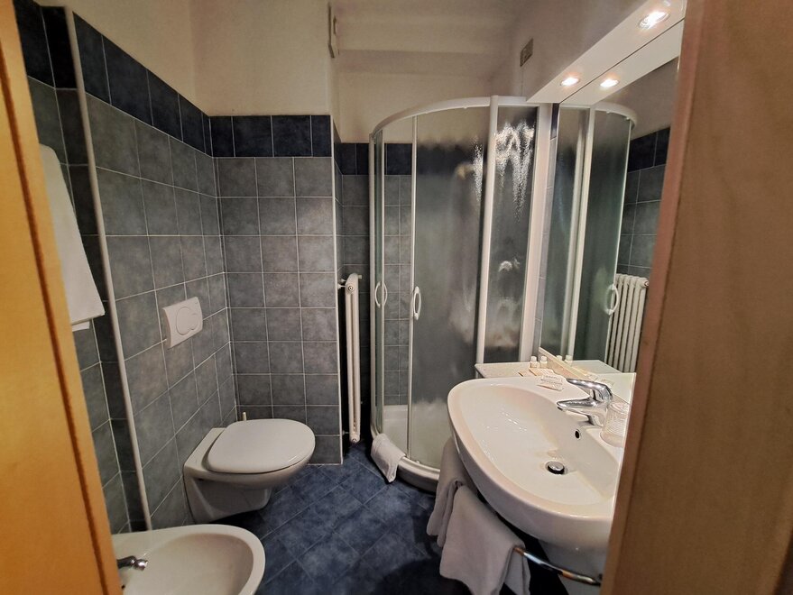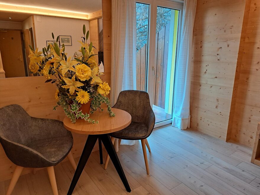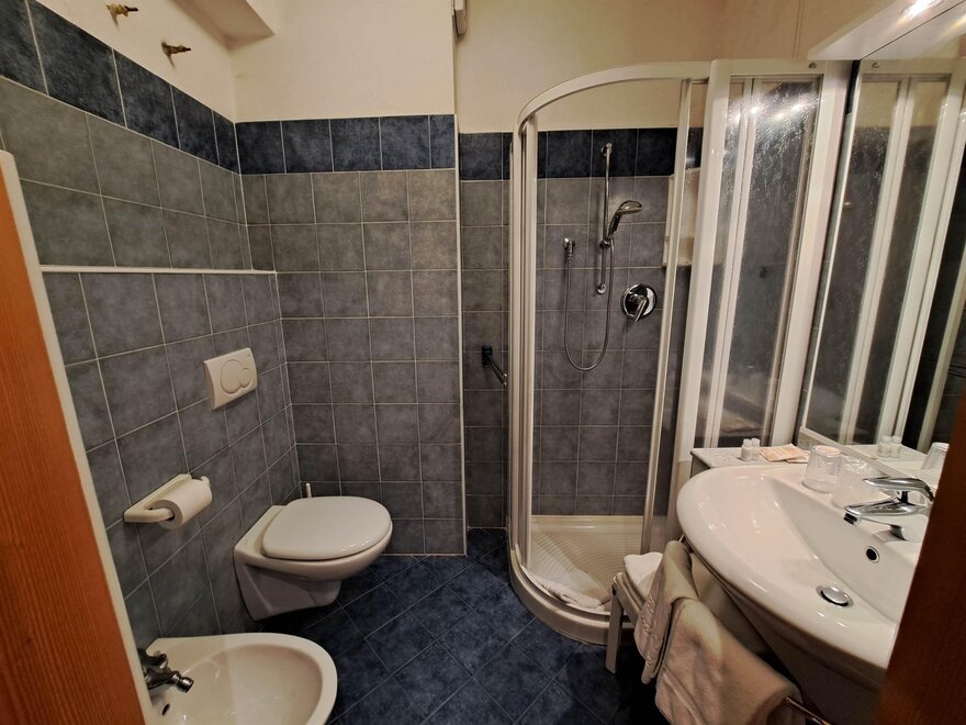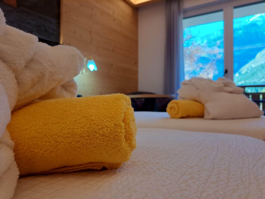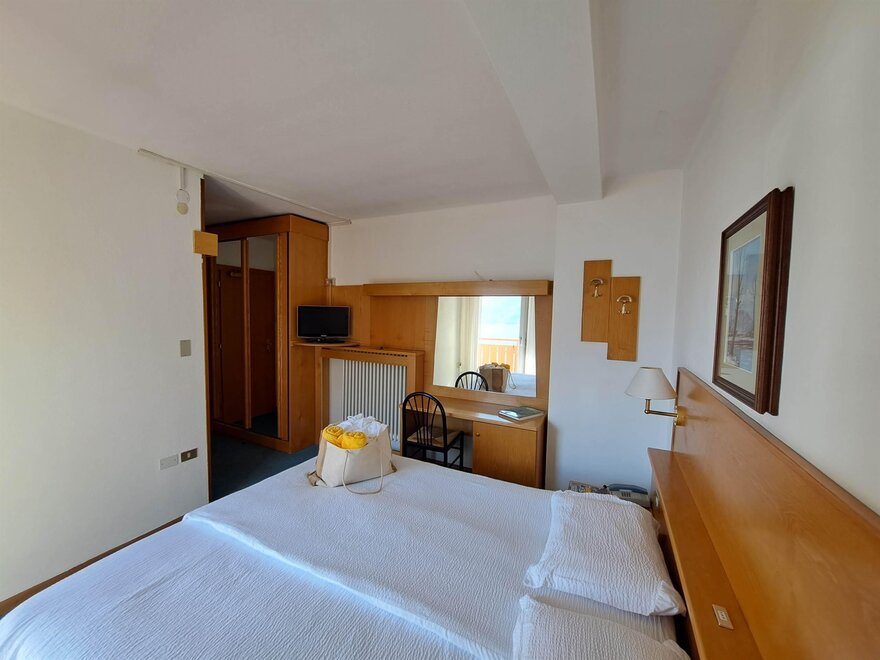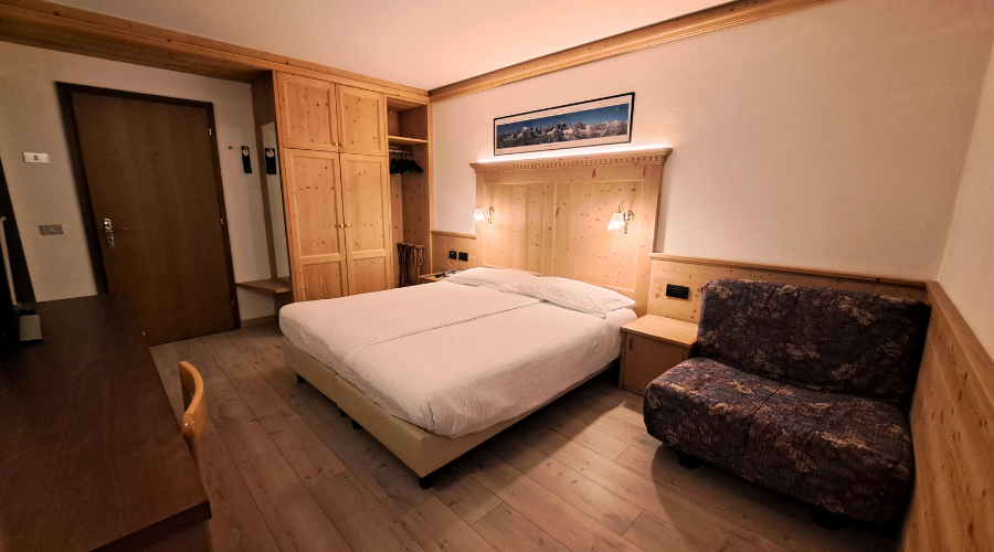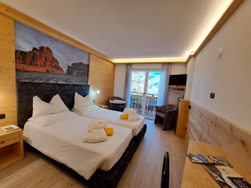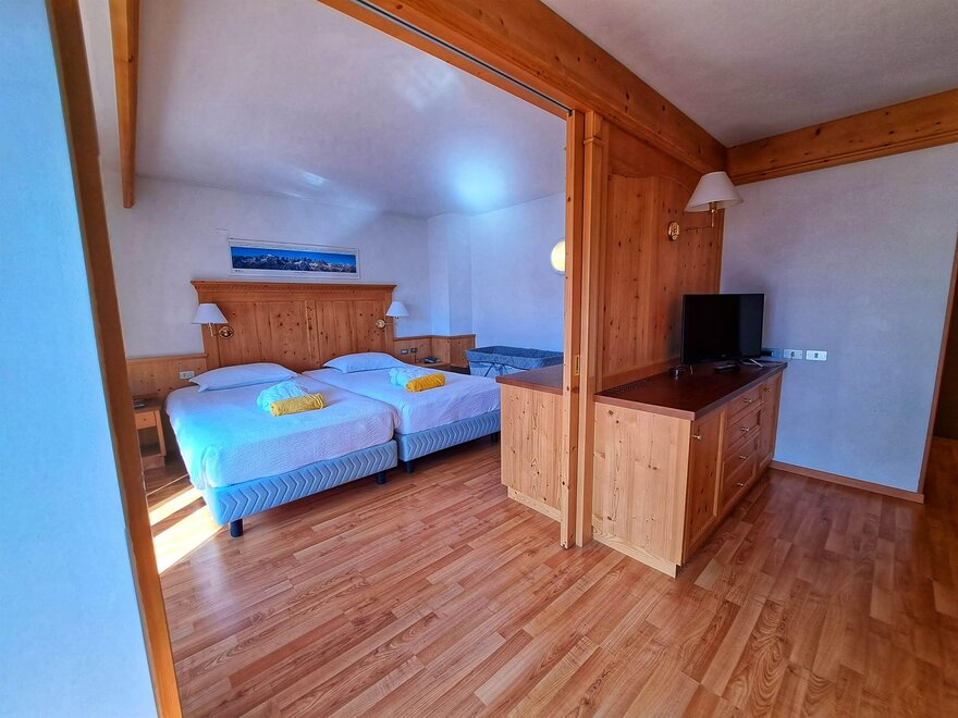 Bright double room measuring approx. 18 m² with a splendid view of the peaks of the Brenta Dolomites or a view of greenery. Choose between a single or double bed in this cosy alpine-style room.