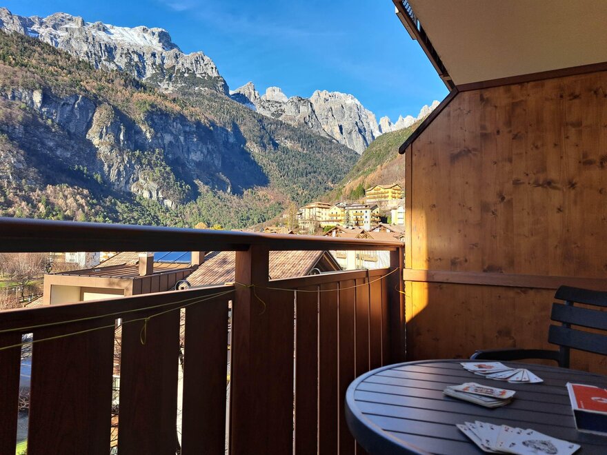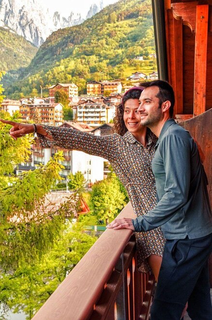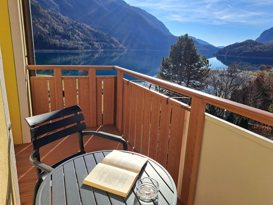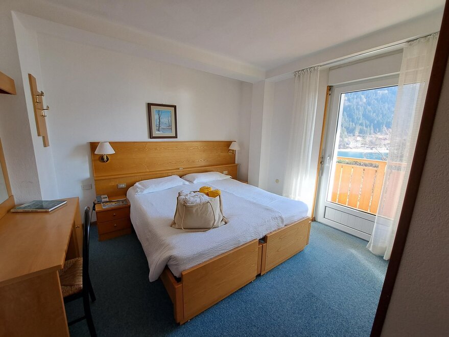 Spacious and bright room designed for couples or families with small children, with balcony with front or side view of Lake Molveno. Immerse yourself in the warm atmosphere created by the fir-wood furnishings and admire the magnificent view from the sunny balcony.