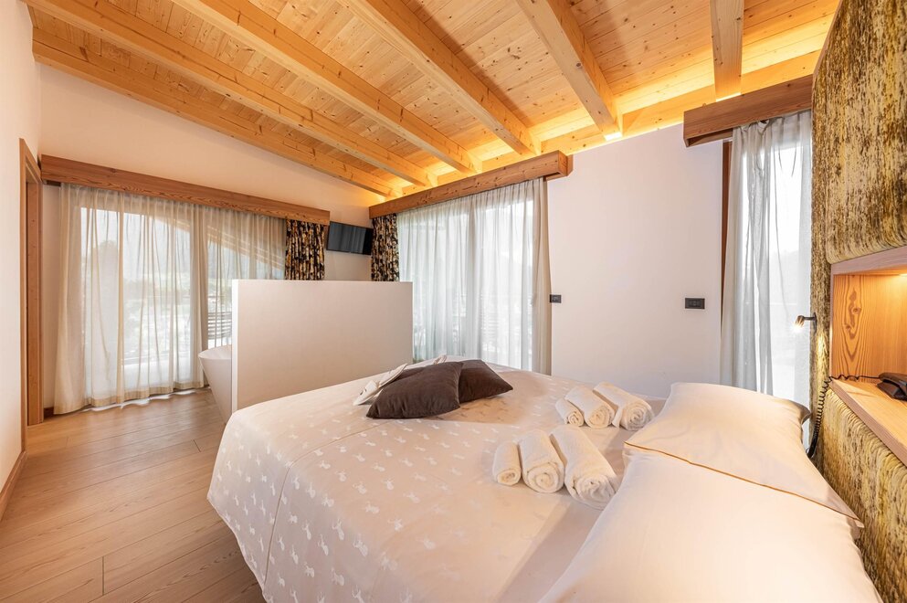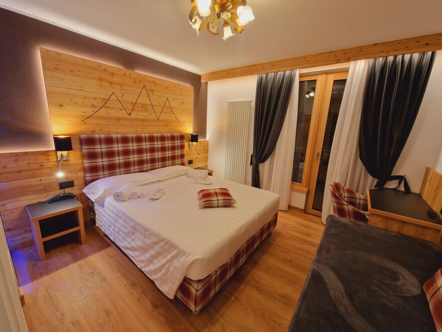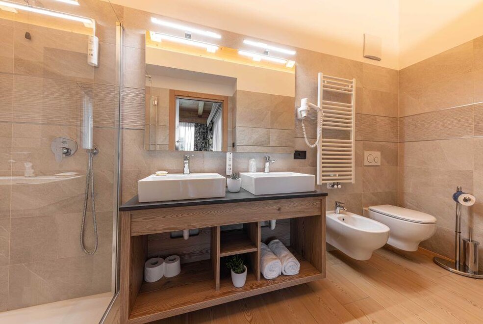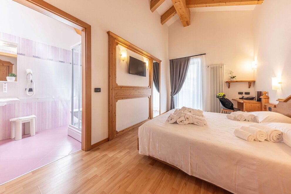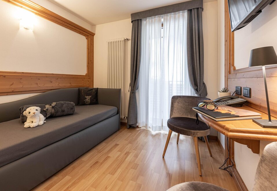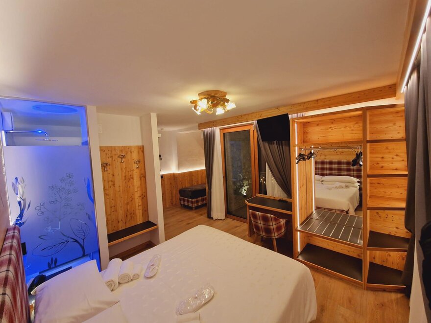 Equipped with excellent amenities and, above all, an atmosphere of enveloping tranquility, with parquet flooring, balcony with mountain views, flat-screen LCD TV, Wi-Fi connection, telephone, safe, minibar, private bathroom with jacuzzi shower, hairdryer, and courtesy setRoom/apartment features