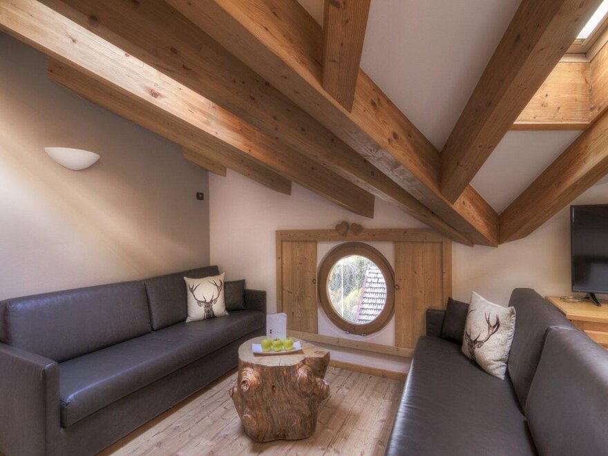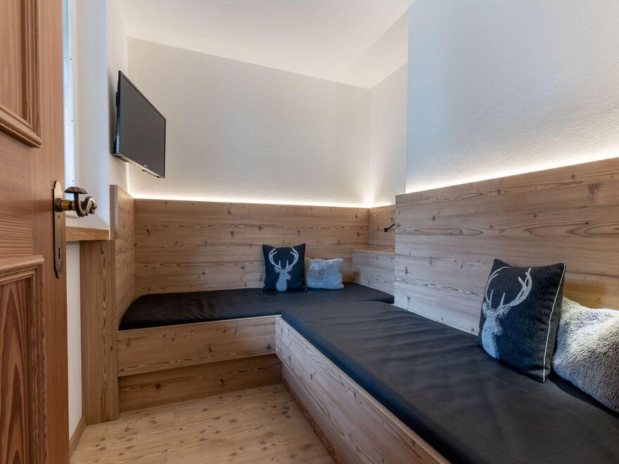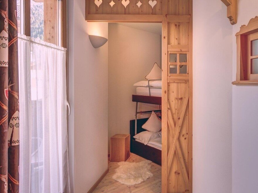 Alpine style, with natural materials, warm tones, and minimalistic design furnishings. The space is organized with a double bed and two single beds for children, separated by a non-closing partition ensuring discreet privacy. On the private balcony, there is a sauna for moments of pure relaxation. Ideal for families seeking comfort, well-being, and a mountain atmosphere in a cozy and welcoming environment.