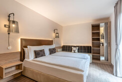 35 sqm room with a modern alpine style, characterized by essential lines and elegant details. The balcony features a private jacuzzi. The environment is divided into two zones: a main bedroom with a double bed and a separate area designed for children, equipped with single beds. The design combines contemporary comfort and a mountain atmosphere, with warm fabrics and neutral colors.
