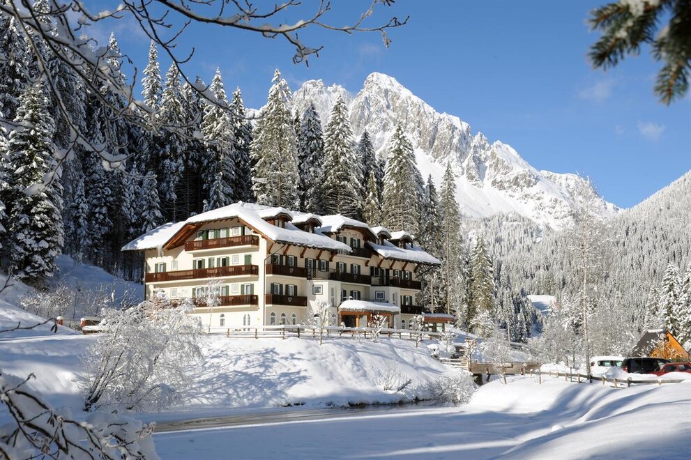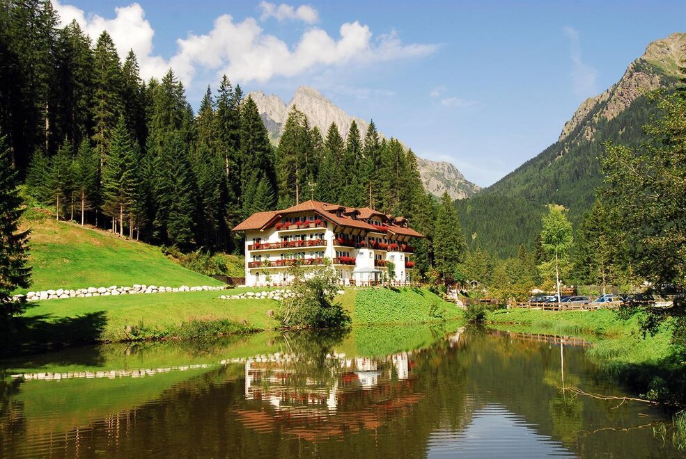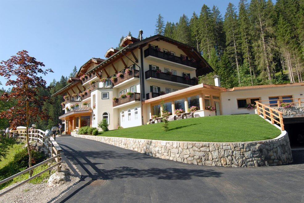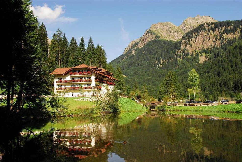 In a splendid, panoramic and peaceful position before the Pale di San Martino. It serves as a starting point for numerous paths for all types of excursions. Rooms with bathroom, telephone, mini-bar, satellite TV; there is also a game room, reading room, broad garden and tennis court. Two free meal vouchers per person for the whole season that may be used at the Rifugio Colverde and the Rosetta 2700 restaurant.