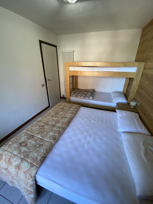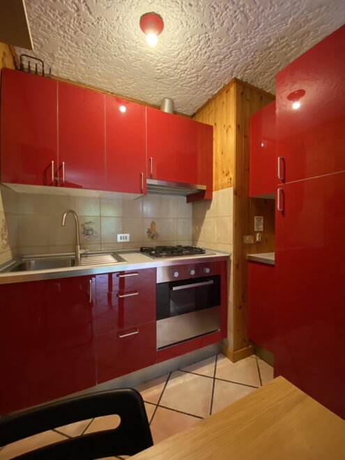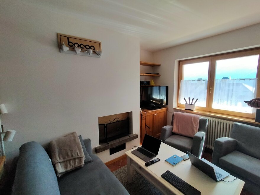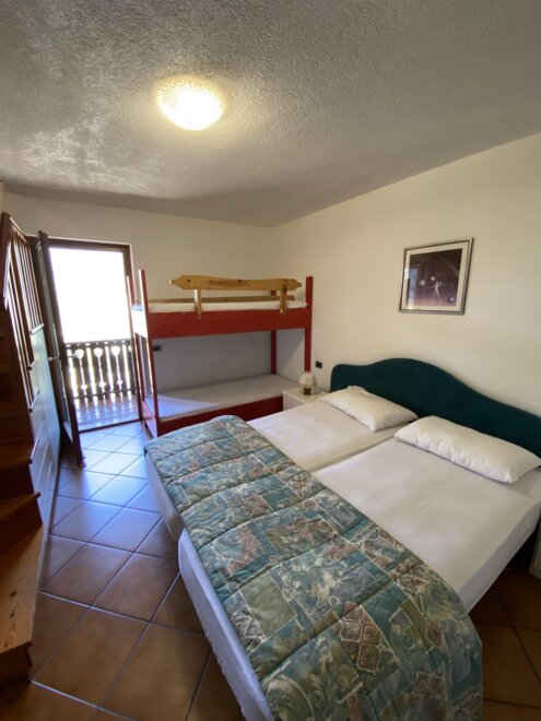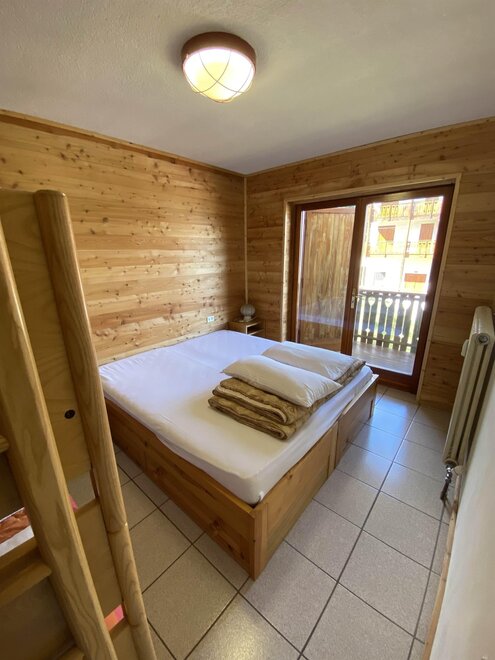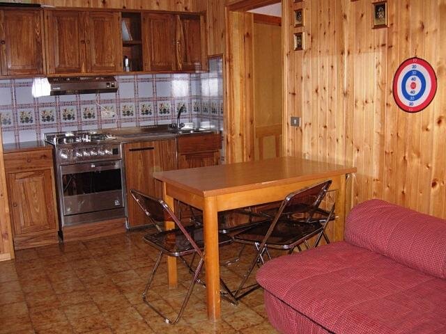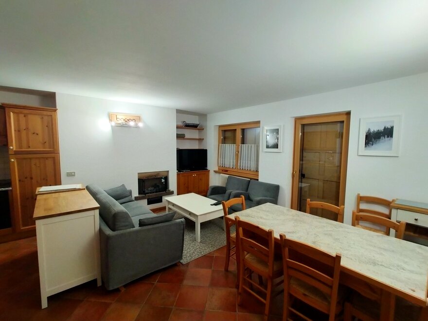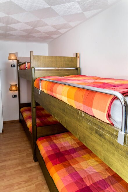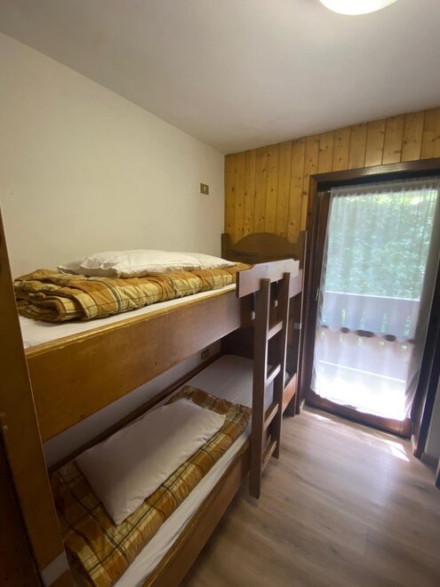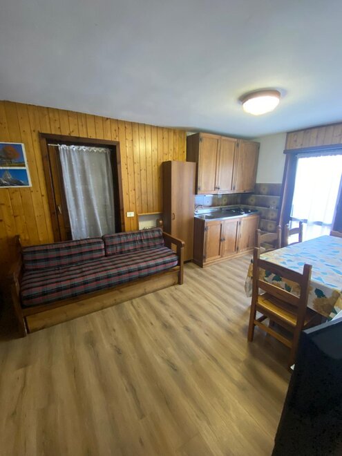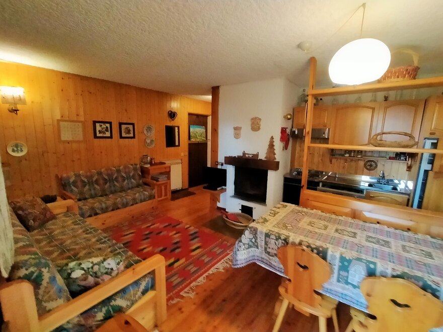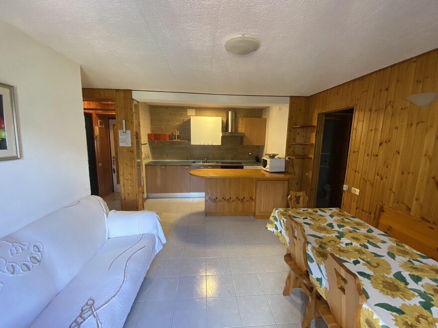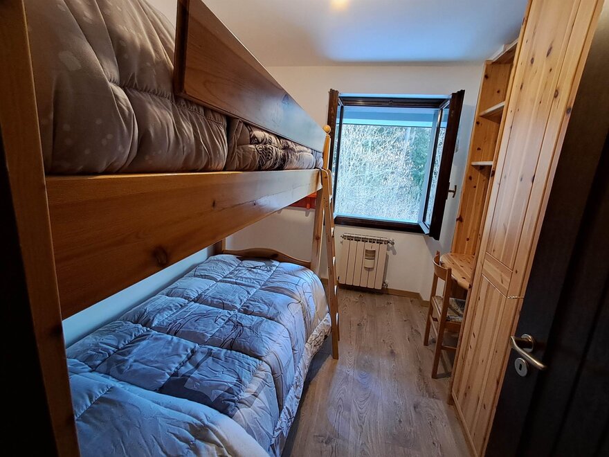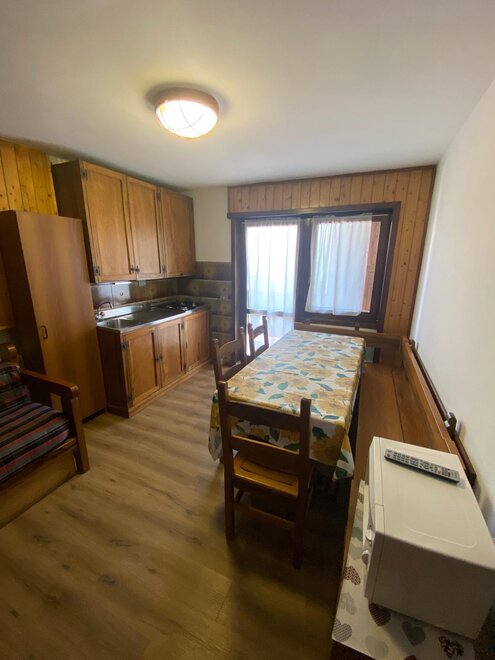 The apartment has a double bedroom and a second room with two bunk beds, perfect for accommodating children or groups of friends. The living area consists of a living room with a sofa and a kitchen equipped with gas hobs, a refrigerator, and a microwave, ideal for preparing meals independently. The accommodation is completed by two balconies, perfect for relaxing outdoors after a day on the snow. The location is particularly convenient: just a short distance from the blue run and the red run, allowing easy access to the lifts and maximizing the enjoyment of a day on the slopes.