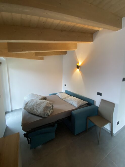 In the living area there is a double sofa bed and a doublebed in the wardrobe and bathroom with shower.