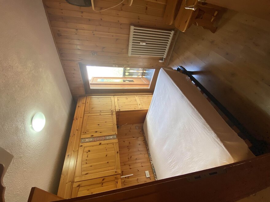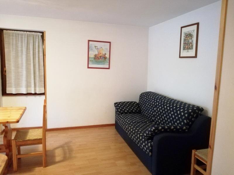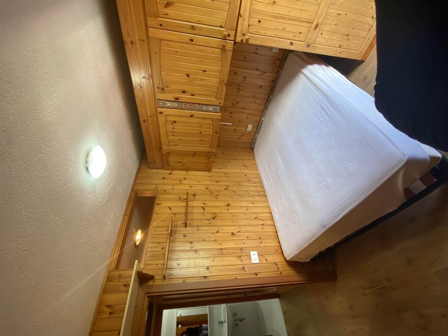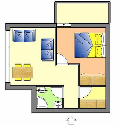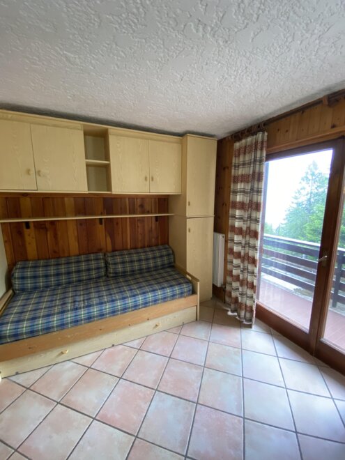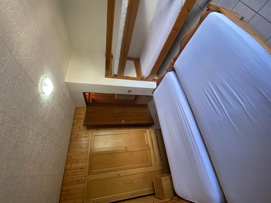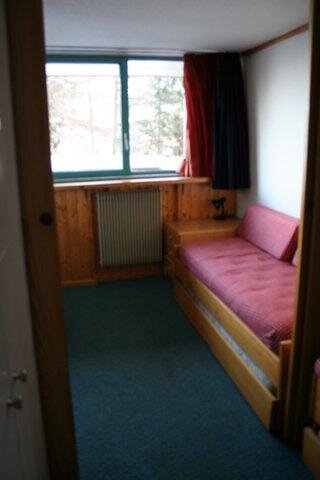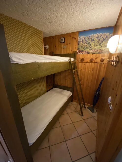 Apartment on the third floor served by an elevator, close to the blue run. Composed of an entrance, hallway, kitchenette separate from the living room, living room with ground floor windows and a sofa bed. Bedroom with a double bed and access to the balcony. Bedroom with a single bed and a loft bed. Bathroom with shower, WC, bidet, and sink. Very basic but comfortable apartment. Ski storage and communal condominium areas.