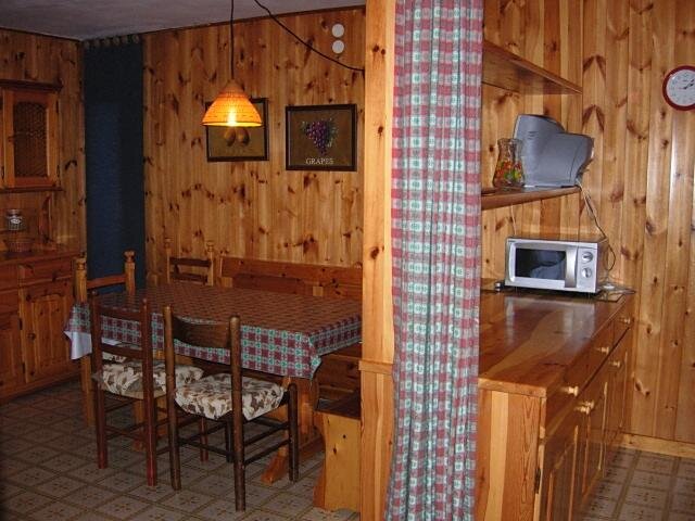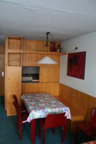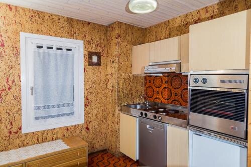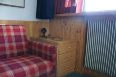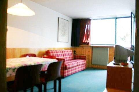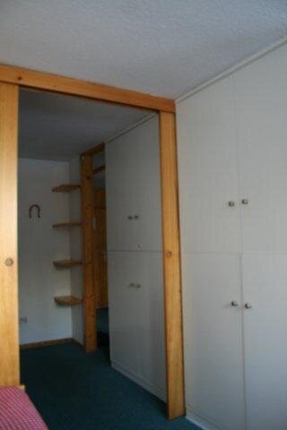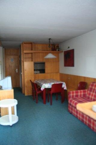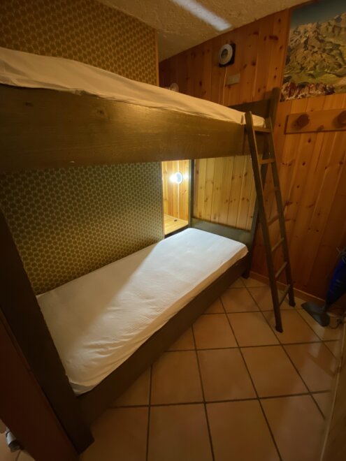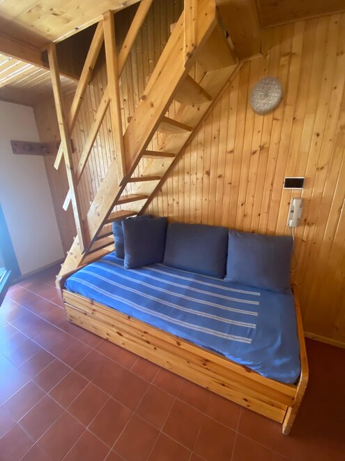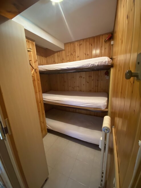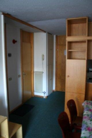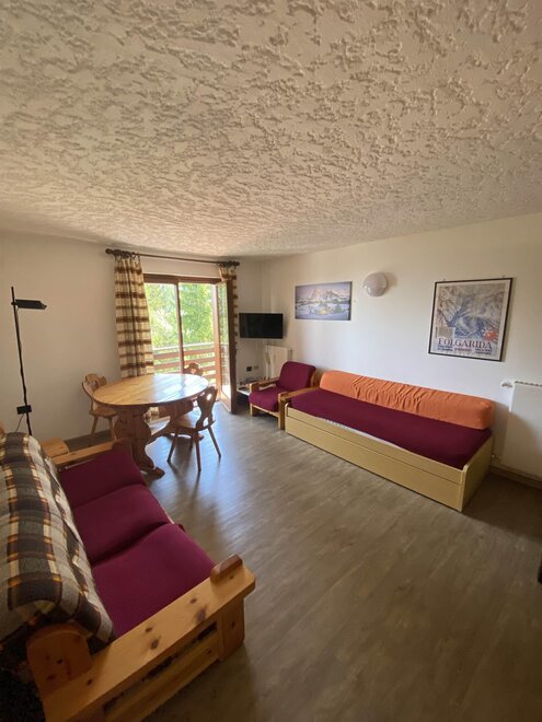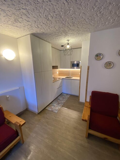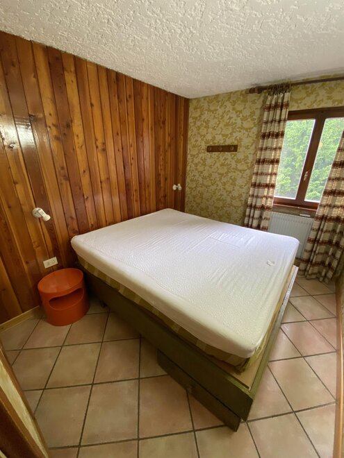 Apartment on the third floor served by an elevator, close to the blue run. Composed of an entrance, hallway, kitchenette separate from the living room, living room with ground floor windows and a sofa bed. Bedroom with a double bed and access to the balcony. Bedroom with a single bed and a loft bed. Bathroom with shower, WC, bidet, and sink. Very basic but comfortable apartment. Ski storage and communal condominium areas.