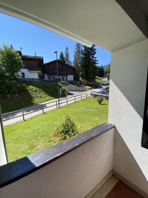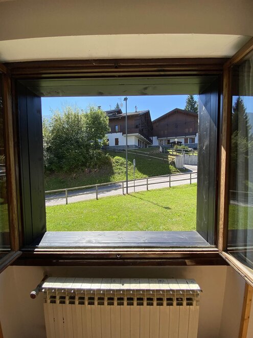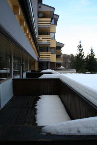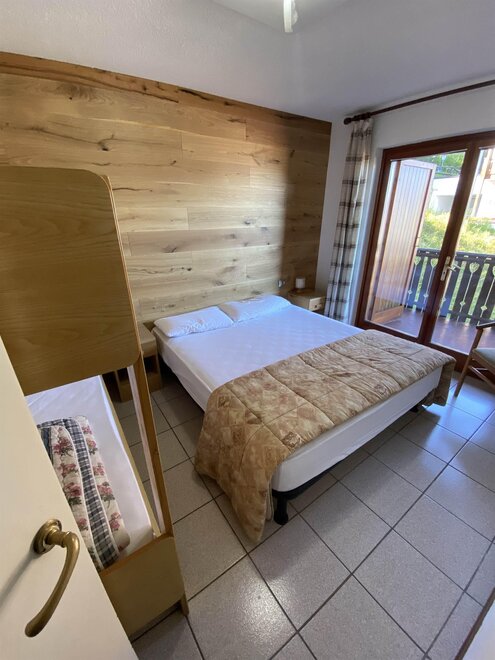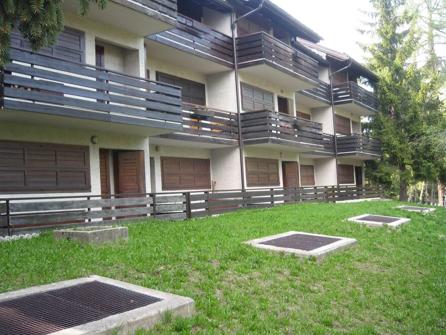 Three-room apartment with a bedroom with two single beds, a room with two bunk beds, a living room with a sofa bed, kitchenette, and shower bathroom. Two spacious balconies on the ground floor, opening onto the communal green area. Large well-equipped kitchen area with a large fridge and fireplace. Very close to the blue slope. Parking space available in the garage.