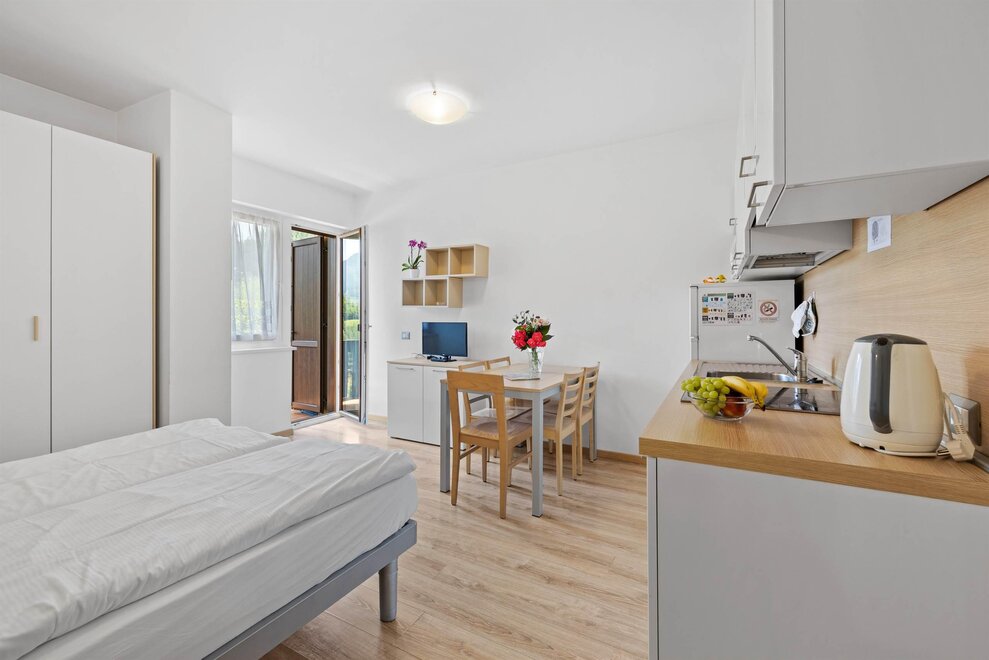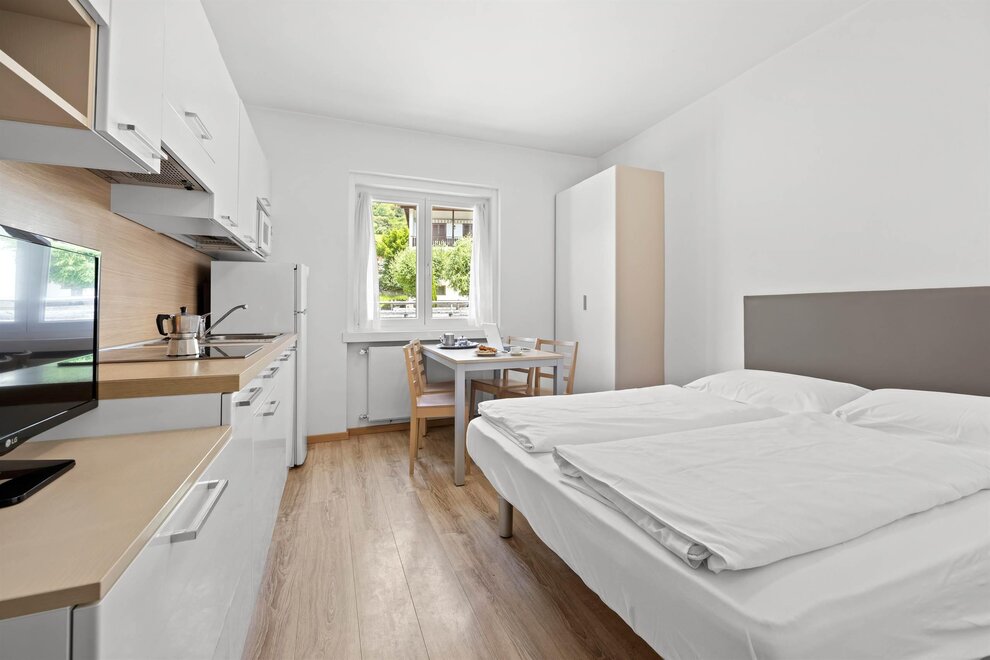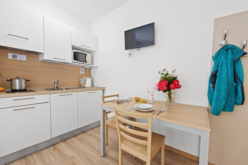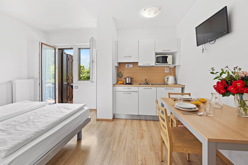 kitchenette, quiet room/apartment, maximum no. of pets: 2, toilet laundry, WiFi, electric stove, kettle, kitchen utensils, heater, feather beds, cooking possibilities, toiletries, bedding, microwave, modern furnishing, freezer compartment, alarm clock, weekly cleaning, refrigerator, dish sink, telephone, towels available, hairdryer, safe, coffeemaker, dishes available, balcony, no carpet, satellite TV, bed linen available, combined bedroom/living room, closet