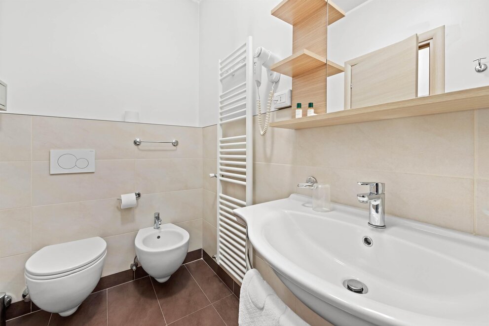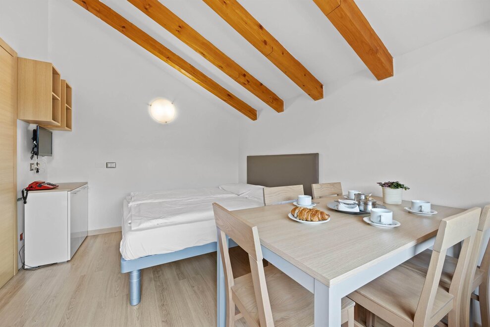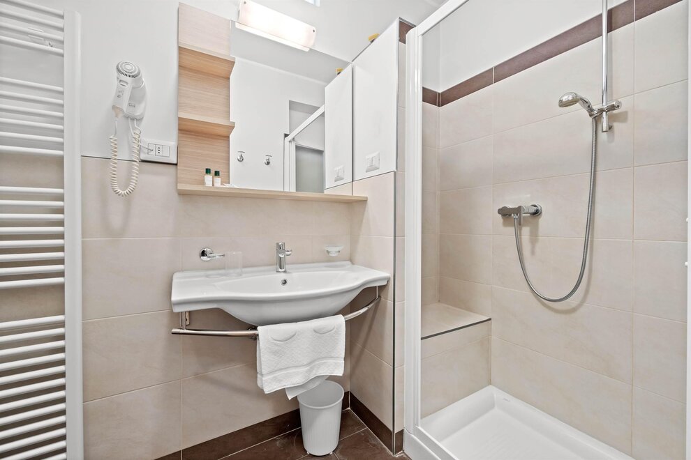 This type of apartment is completely renovated: living-dining area with doublebed, kitchenette, double bedroom, bedroom with a single bed, bathroom with shower and balcony. All apartments have LCD TV, telephone, safe, kitchen equipped with refrigerator, pots, pans and glasses, microwave, moka, kitchen cleaning kit (detergent, sponge and dishcloth), bathroom with shower, bidet, toilet and hairdryer. Also provided are blankets, pillows and bed linen and towels with weekly change.