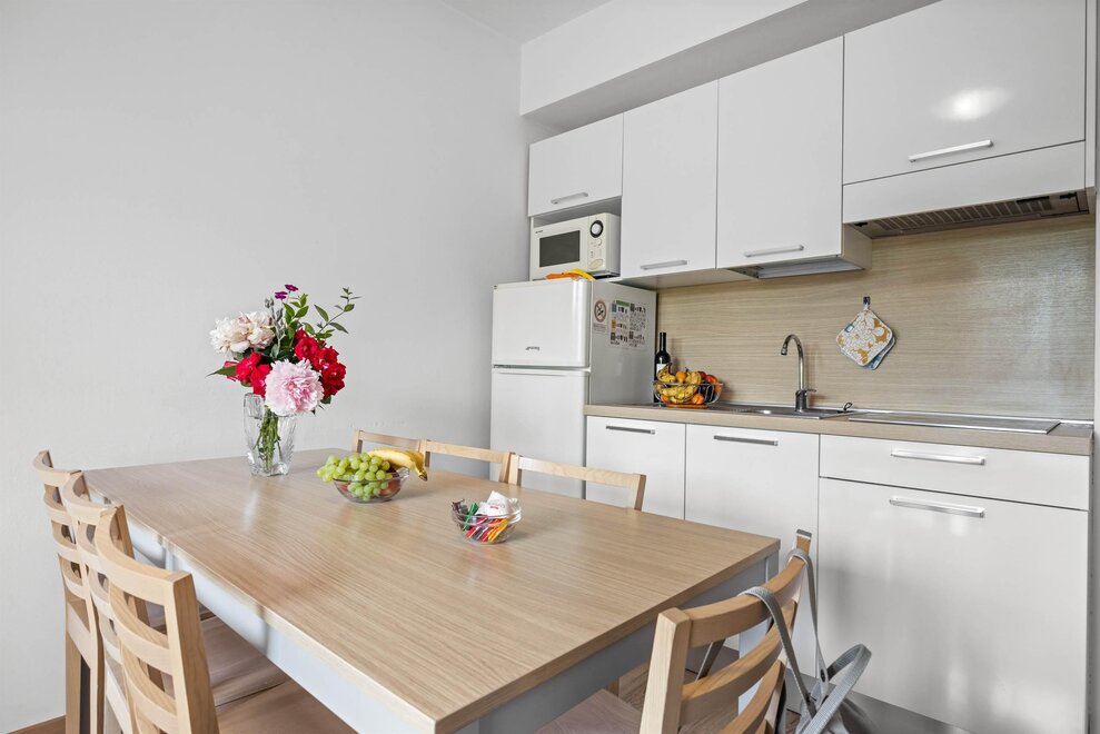 This apartment is completely renovated: living-dining area with kitchenette and double bed, double bedroom, bathroom with shower, balcony. All the apartments have LCD TV, telephone, safe, fully equipped kitchen with refrigerator, cookware, dishes and glasses, microwave, moka, kitchen cleaning kit (detergent, sponge and dishcloth), bathroom with shower, bidet, toilet and hairdryer. Also provided are blankets, pillows and bed linen and towels with weekly change.