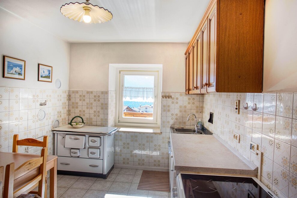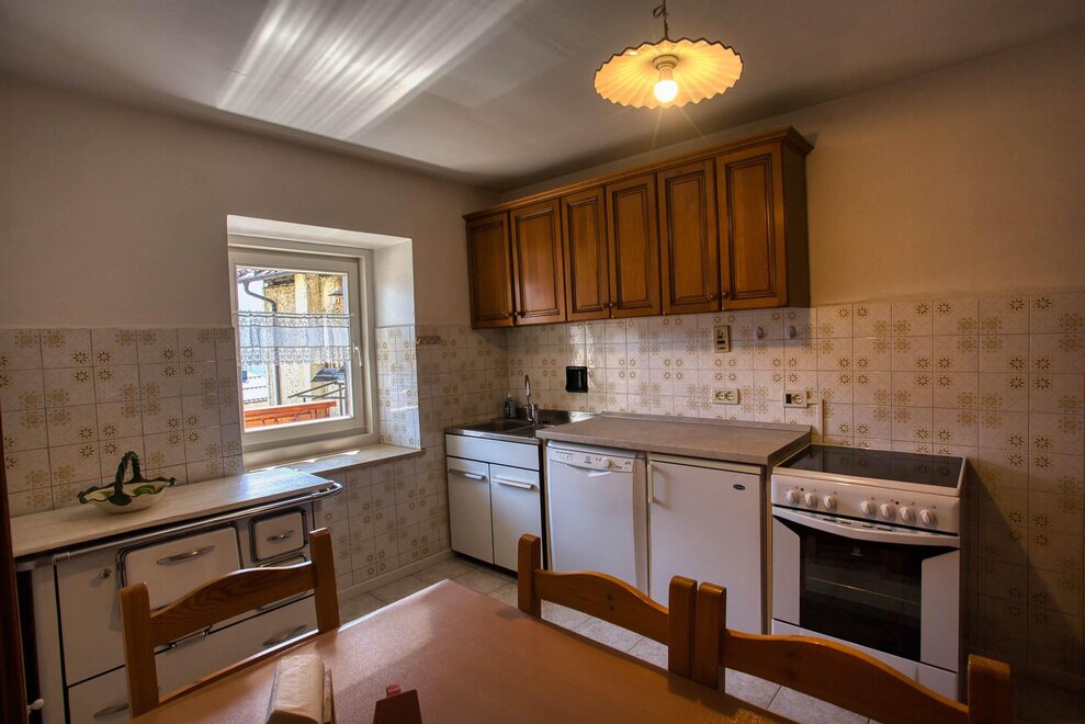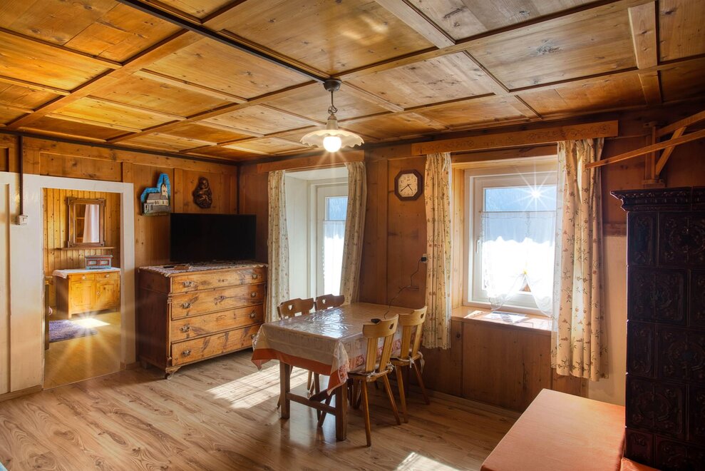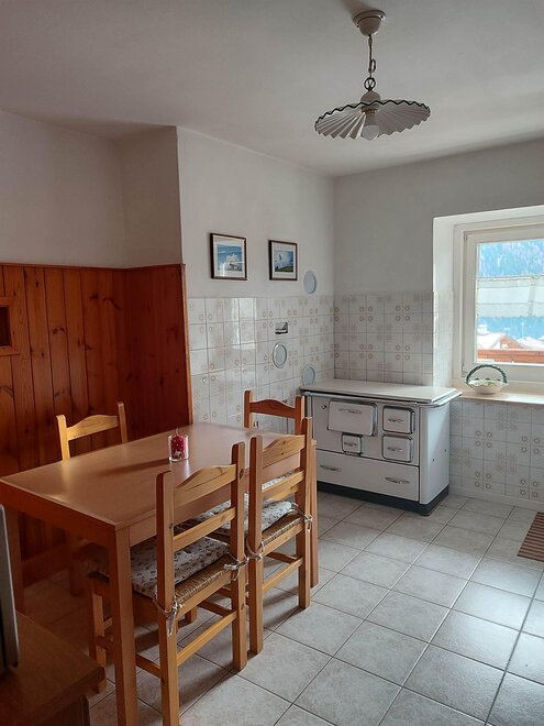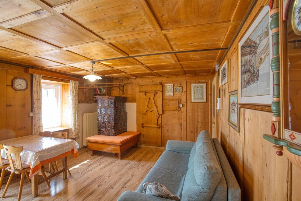 Apartment consisting of a large living room covered in wood like the German parlours with sofa, tiled stove and bench room. Wall-mounted table . Above the stove there are two wooden arms that over the years were used to dry clothes. A wooden passage that communicates with the kitchen. To the side there is a bookcase corner. TV, an old wooden chest of drawers. In one corner an old treadle sewing machine. . On one side of the wall there are paintings and family photos.