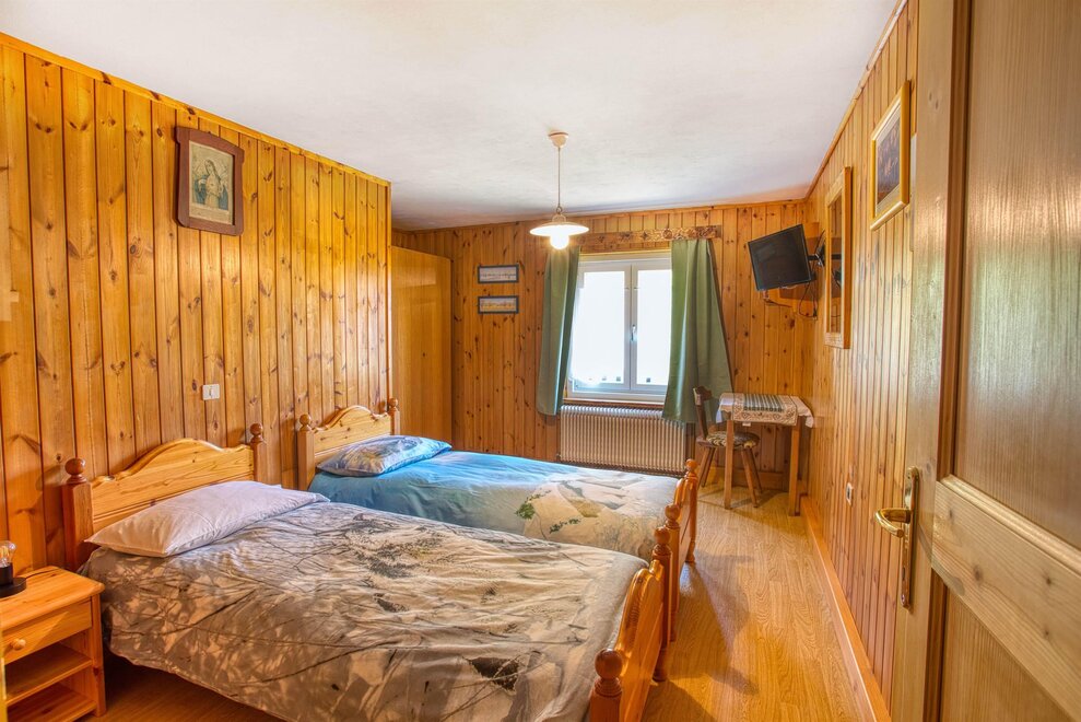 A large bedroom with two single beds. Wardrobe, table and TV. Shelf with children's books.