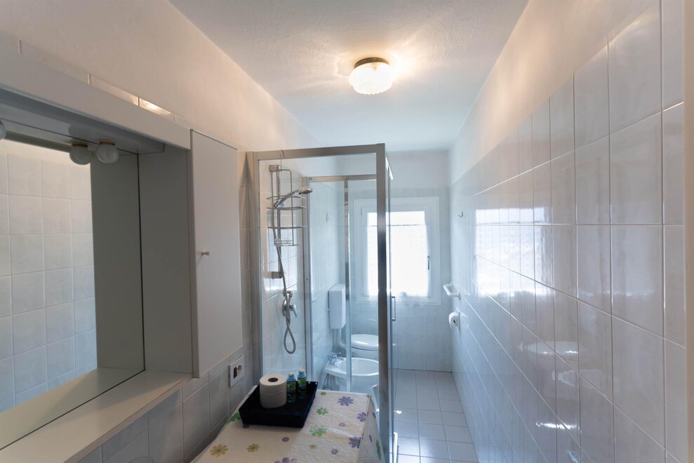 Bathroom with window equipped with washing machine, shower, bidet and hairdryer.