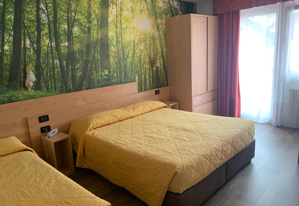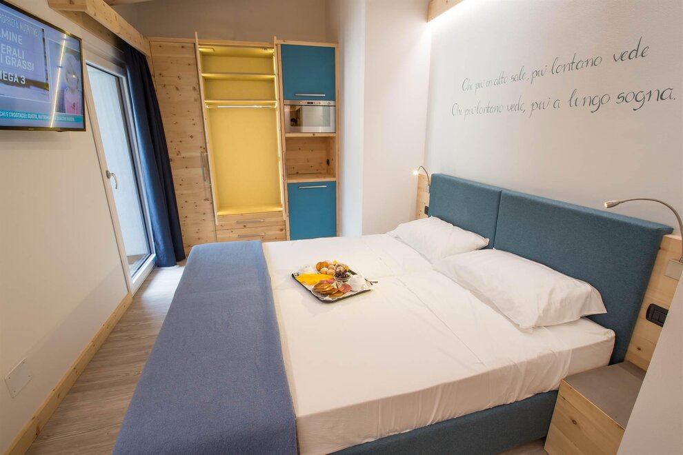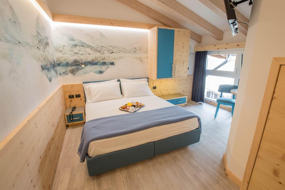 Doubleroom Ginevra, with solid wood interiors. There is wi-fi, telephone, LCD, safe, hairdryer, courtesy set, hydromassage shower. Most have a balcony. Baby cots, bedside tables, baby cribs, mini fridge, hot water bottle and strollers are available for children.