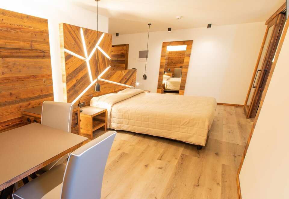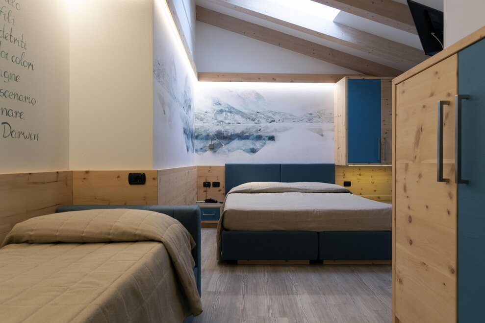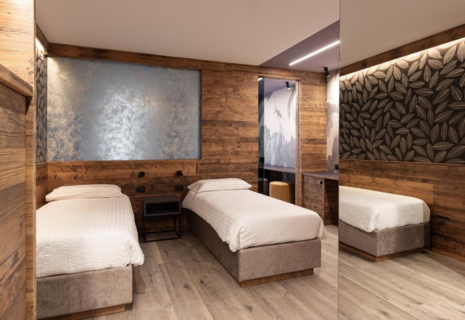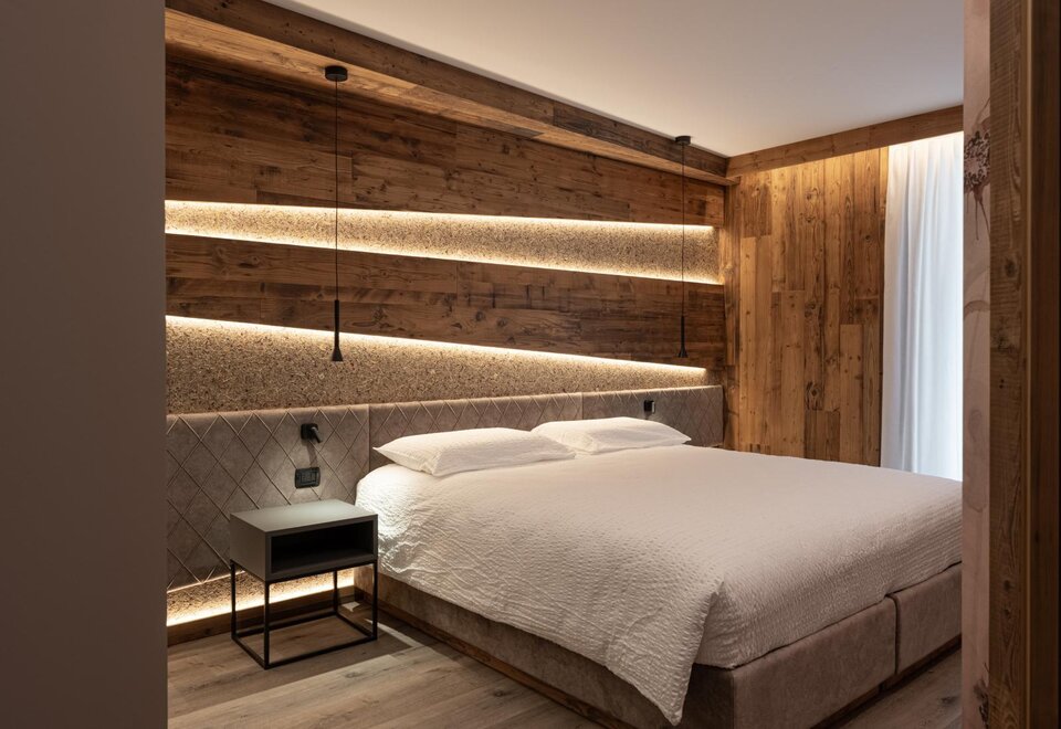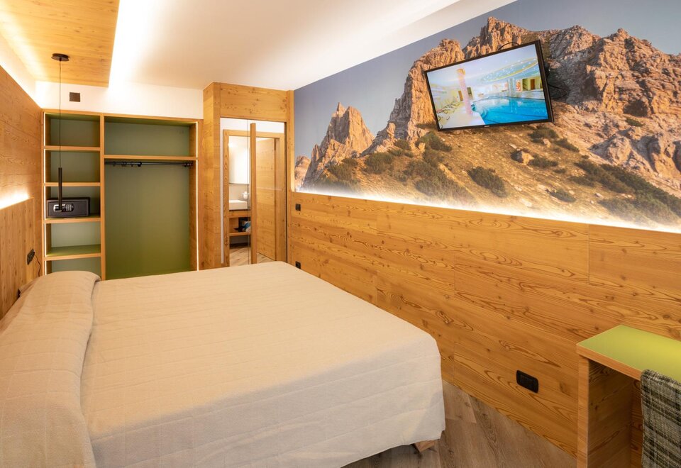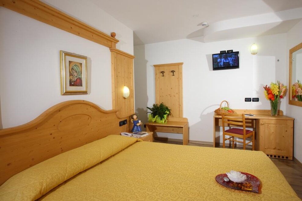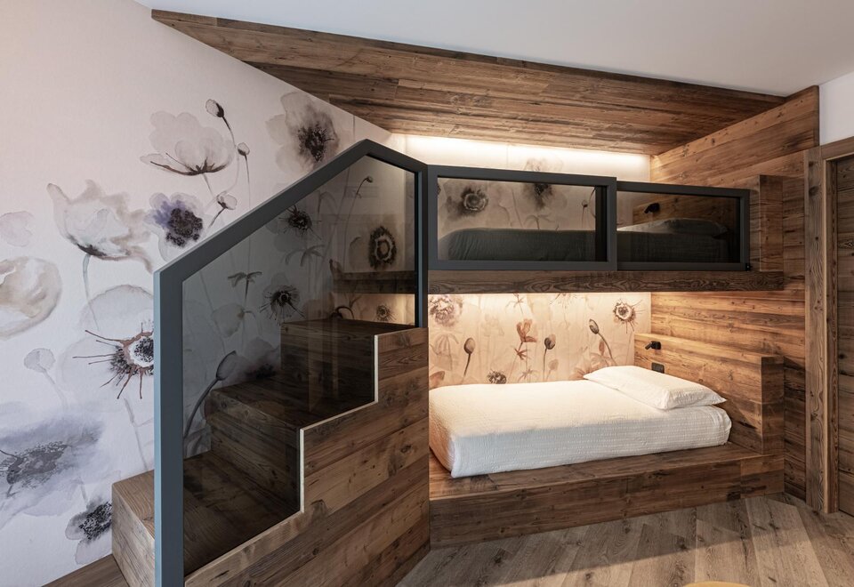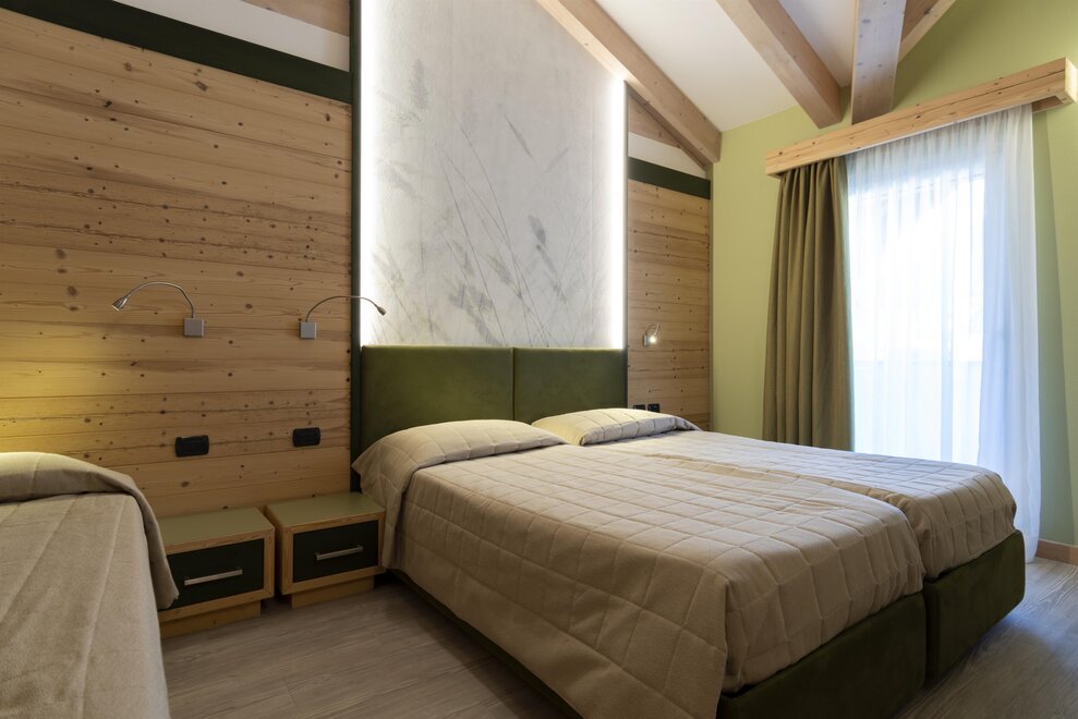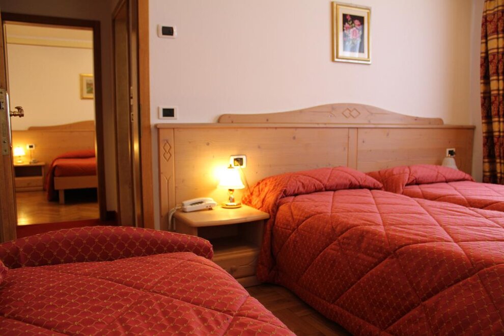 Family Dolomiti accommodation for families with two connecting rooms, spacious in warm solid wood, with wi-fi, telephone, LCD, safe, hairdryer, complimentary toiletries, equipped shower. All rooms have a balcony. For children, cots, bed rails, changing tables, minibars, bottle warmers, and strollers are available.