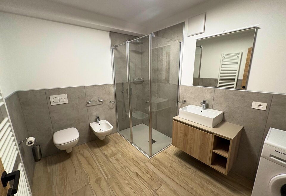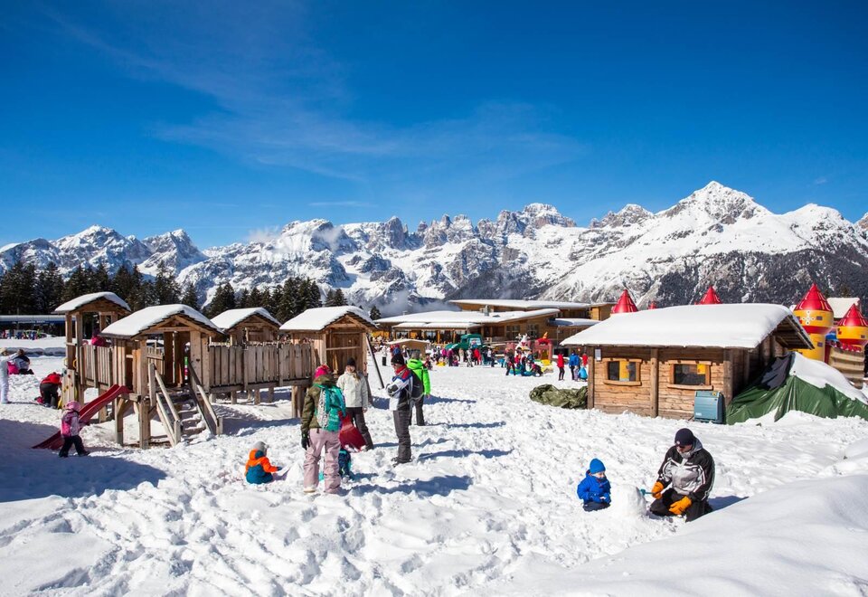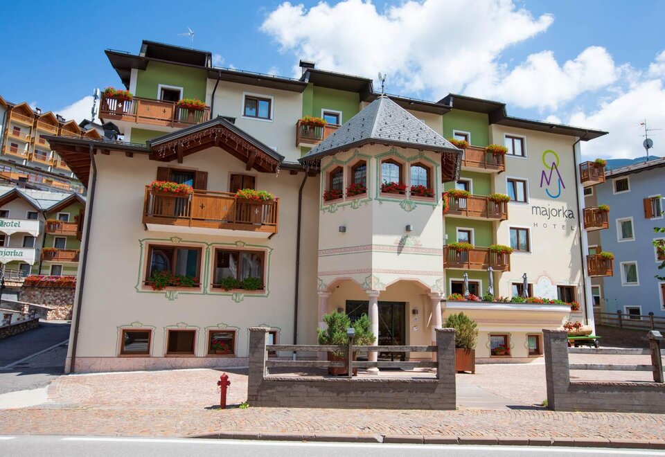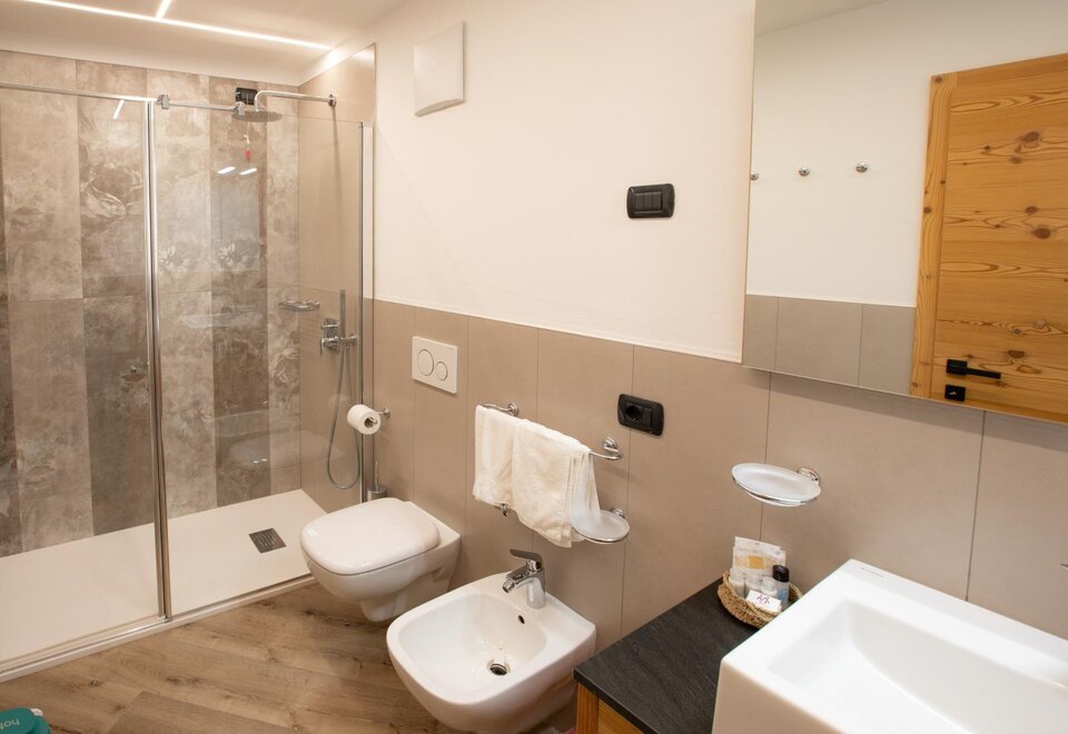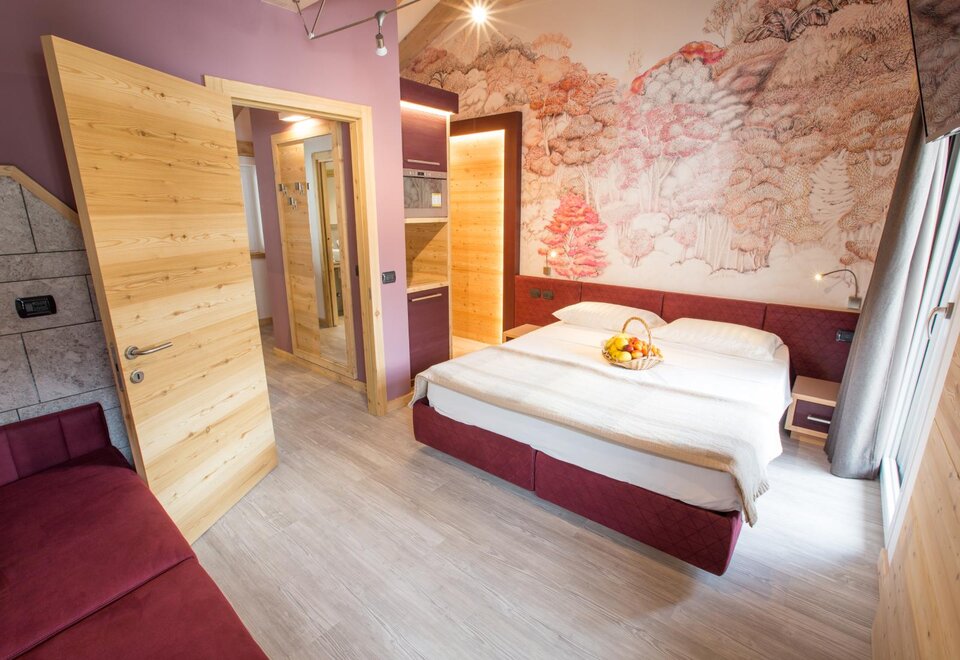 Family accommodation Family Dolomiti with two rooms, spacious warm hardwood. There is Wi-Fi, telephone, LCD, safe, hairdryer, complimentary toiletries, shower. All rooms have a balcony. For children there are cots available, rails, changing tables, refrigerator, bottle warmer and baby carriage.