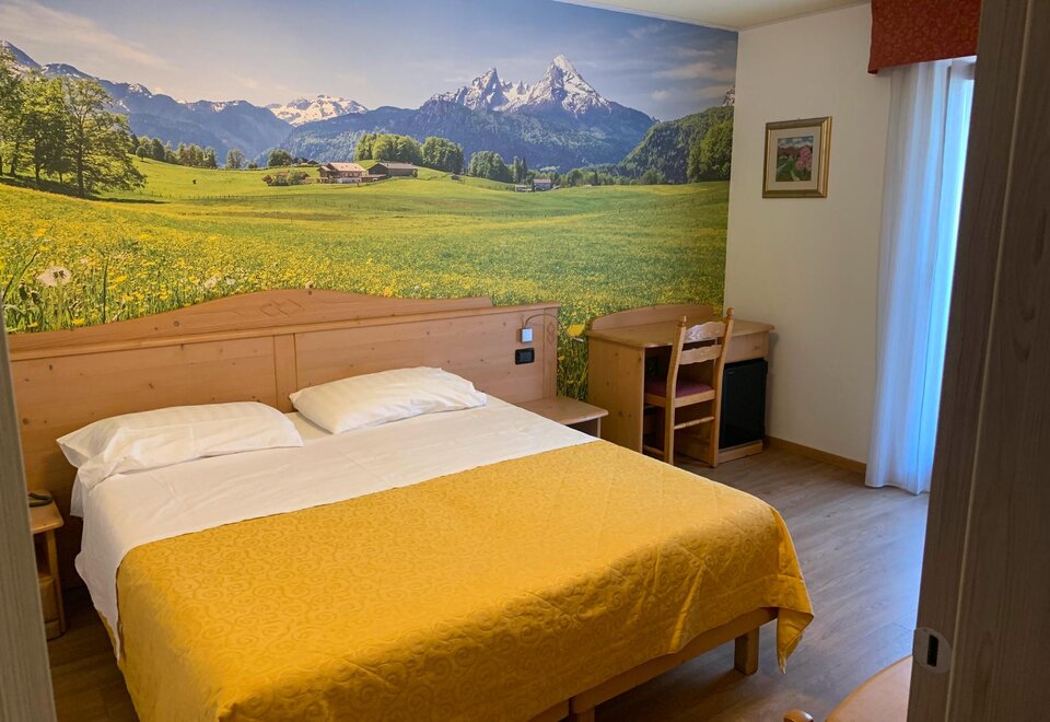 The double rooms + Alpine Lily bed are traditionally furnished with warm solid wood, feature a balcony, fridge, Wi-Fi, safe, flat screen TV with 10 SKY channels, bathroom with shower, bidet, hairdryer, courtesy set with flip-flops,