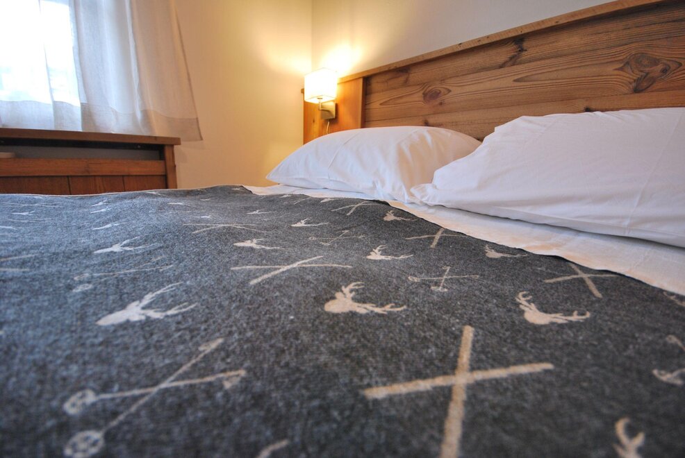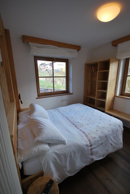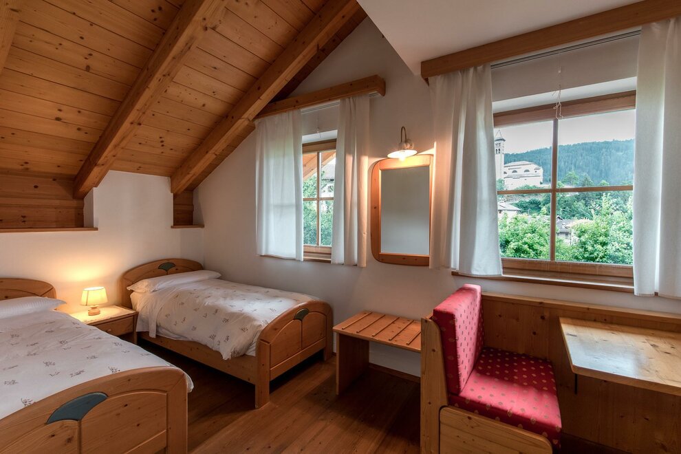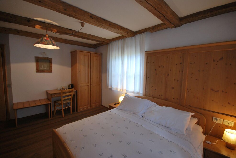 Double bedroom with French bed. The room is very bright, with a view of the village church. To offer you the best restful sleep, we have equipped all our rooms with new mattresses with a top layer of memory foam, technology that adapts to your body to allow you to rest better. The floor in our rooms is made of natural larch wood from the Fiemme Valley with underfloor heating, for better heat distribution over the entire surface. Each room is self-heating, each guest can adjust the room temperature quickly and easily. The room is equipped with every comfort, in particular you will find: television Wifi connection hairdryer set of towels