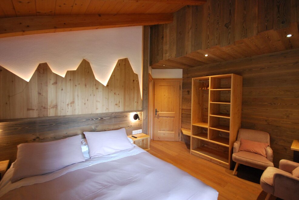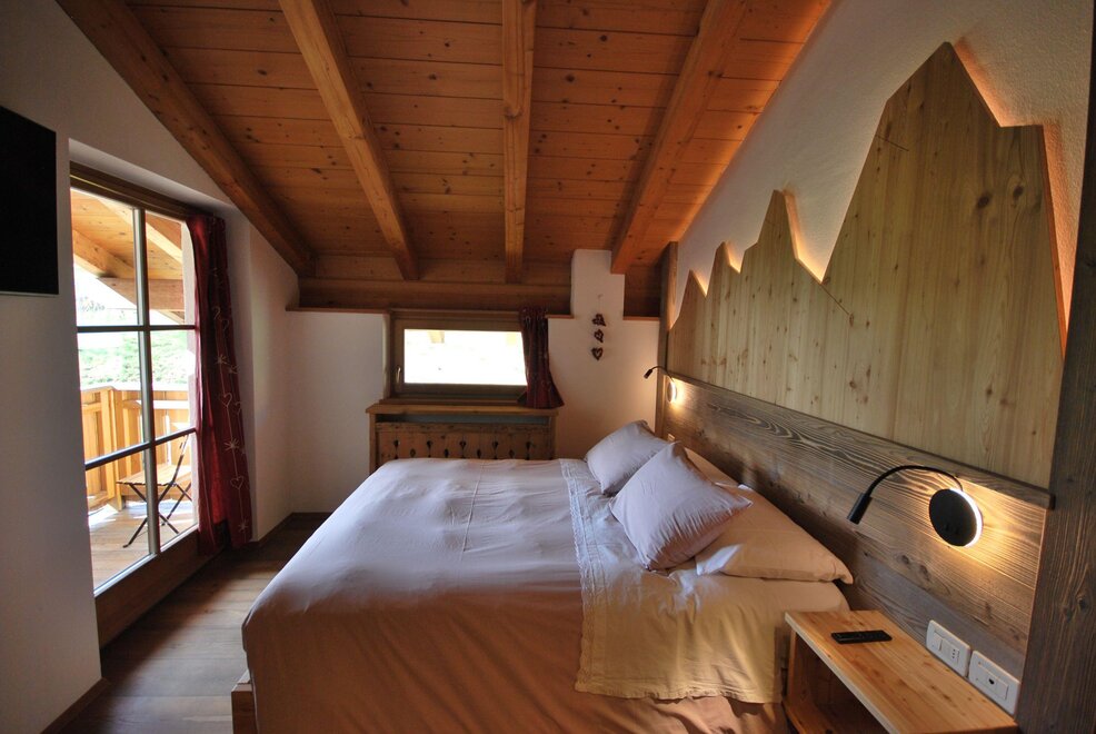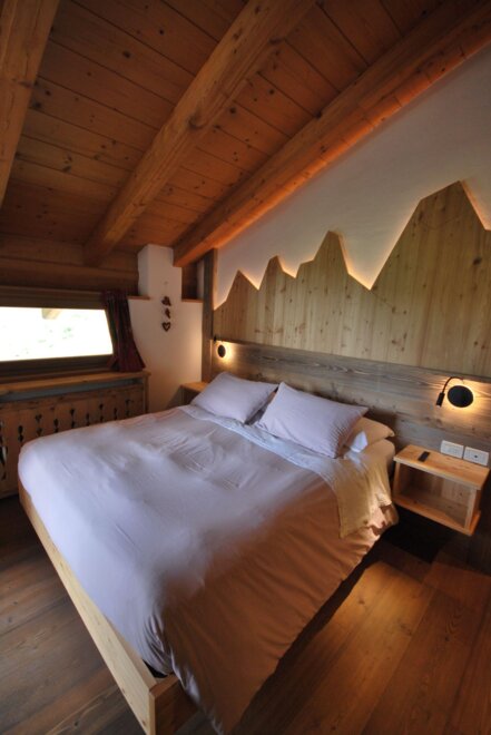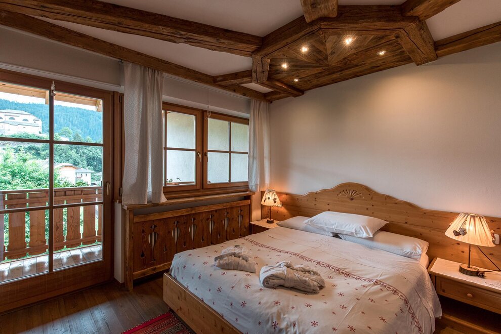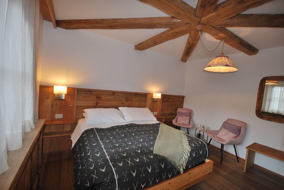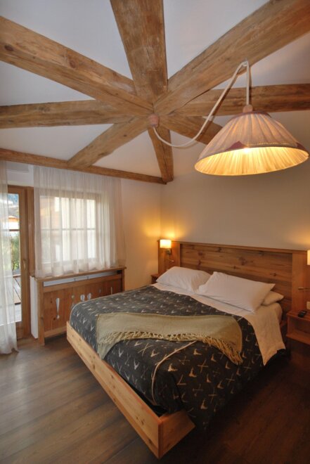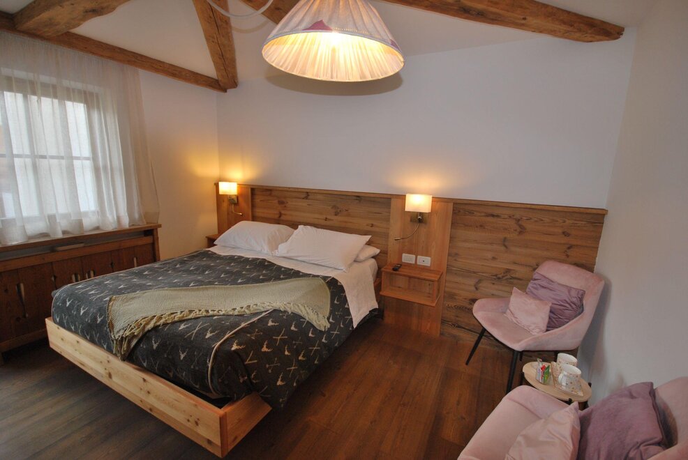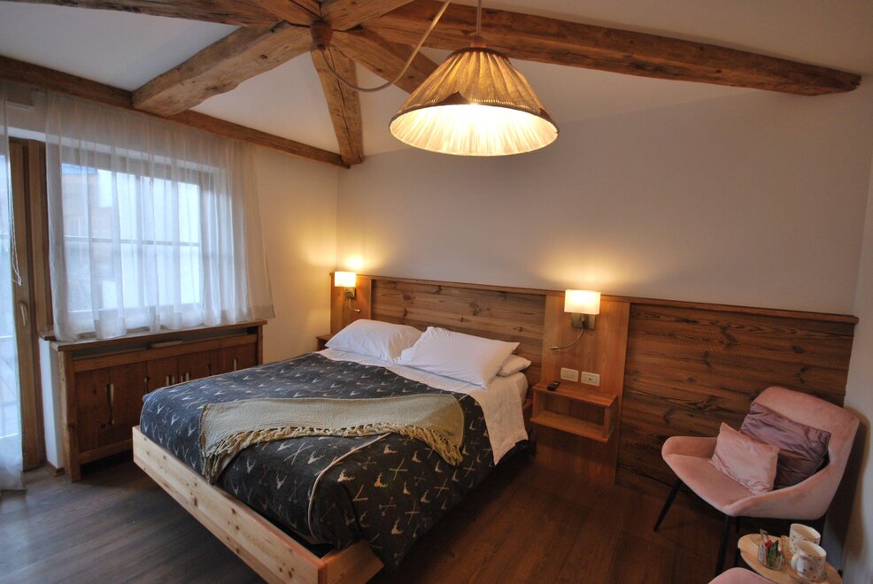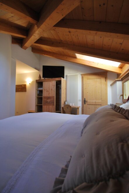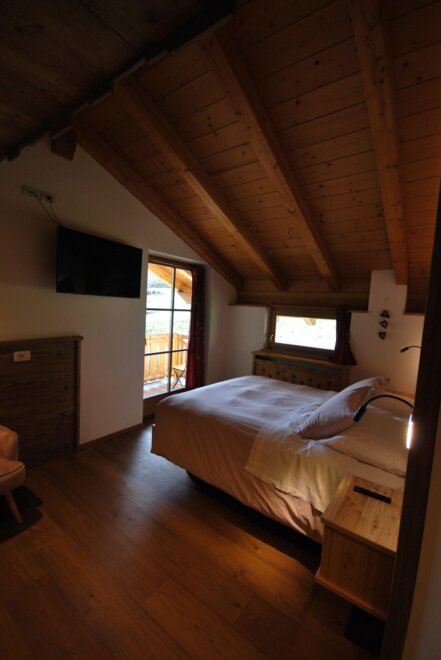 The superior double room with private garden is one of our gems: furnished in antique wood from the Fiemme Valley, with a delicate and relaxing scent of wood reminiscent of the woods. A linear but warm and welcoming decor, perfect for a stay for two. To offer you the best restful sleep, we have equipped all our rooms with new mattresses with a top layer of memory foam, technology that adapts to your body to allow you to rest in the best possible way. This room is suitable for hosting guests with disabilities, being spacious and without architectural barriers. The room is equipped with every comfort, in particular you will find: SMART-TV Wifi connection hairdryer set of towels In the private garden you will find a very comfortable hammock where you can relax, a table with bench and chairs and deck chairs where you can read a good book.