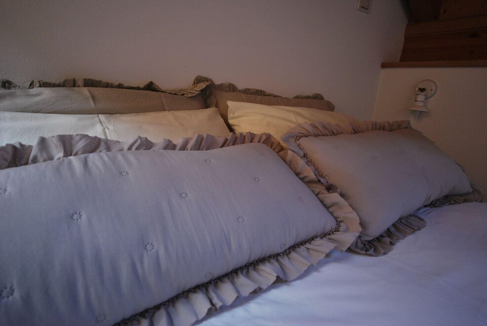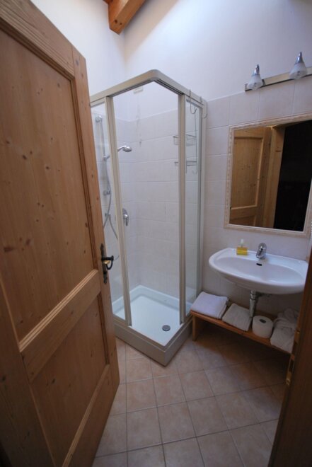 The family suite, large and bright, consists of an attic double bedroom with a balcony overlooking the mountains and the beautiful and evocative village church, a room with two single beds and an optional third bed, and a communicating bathroom. Ideal for a family holiday where everyone has their own space. To offer you the best restful sleep we have equipped all our rooms with new mattresses with a top layer of memory foam, a technology that adapts to your body to allow you to rest at its best.