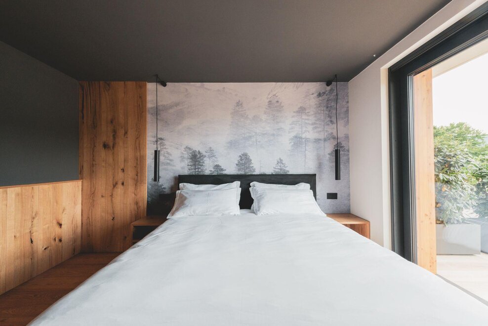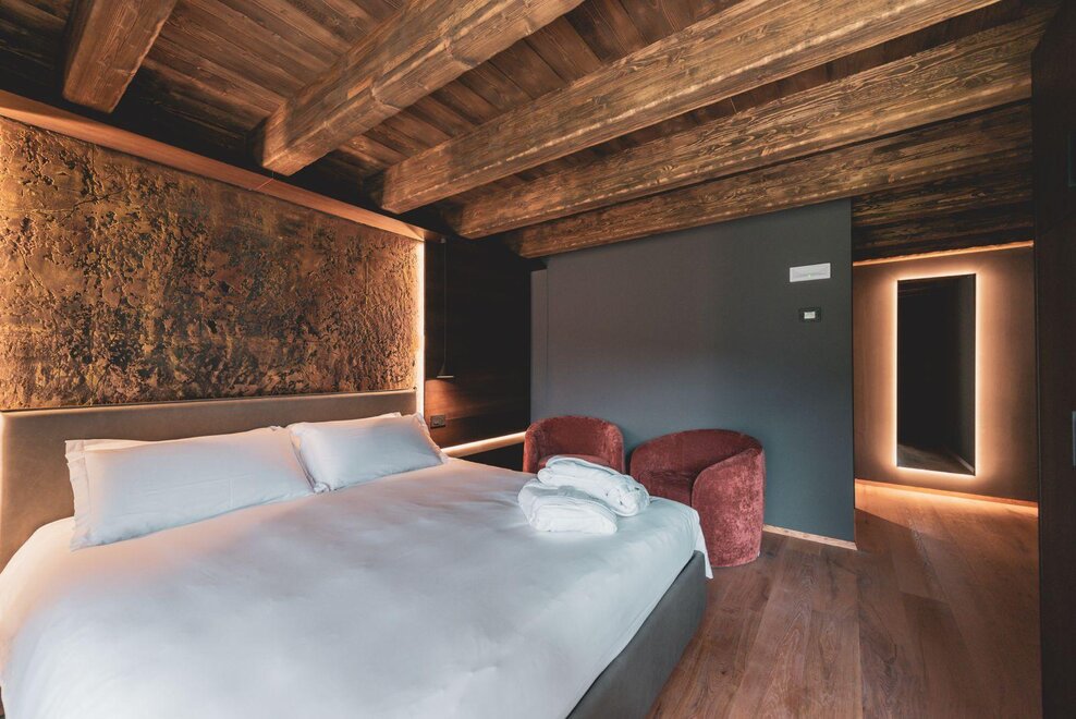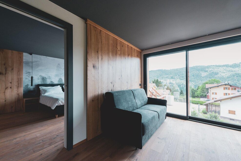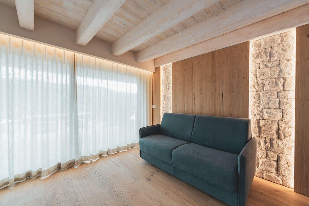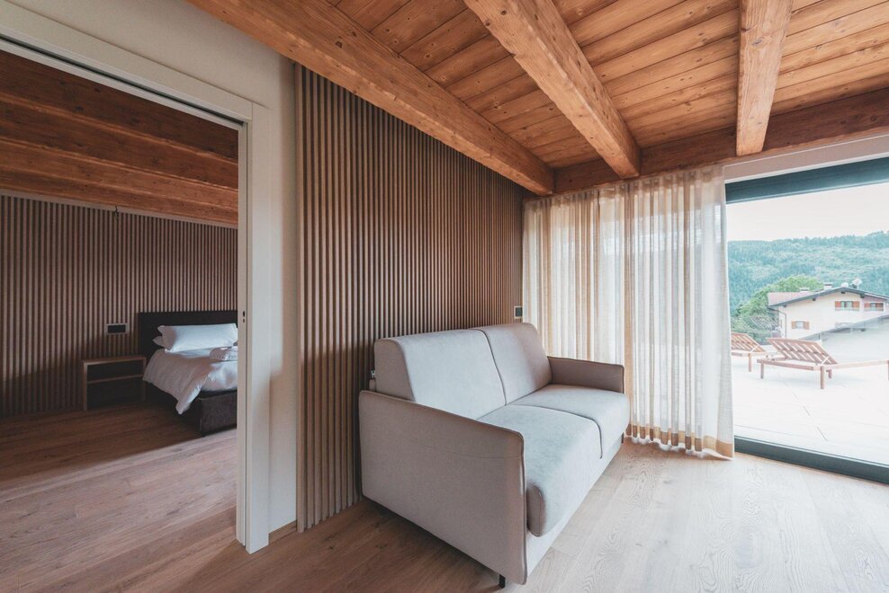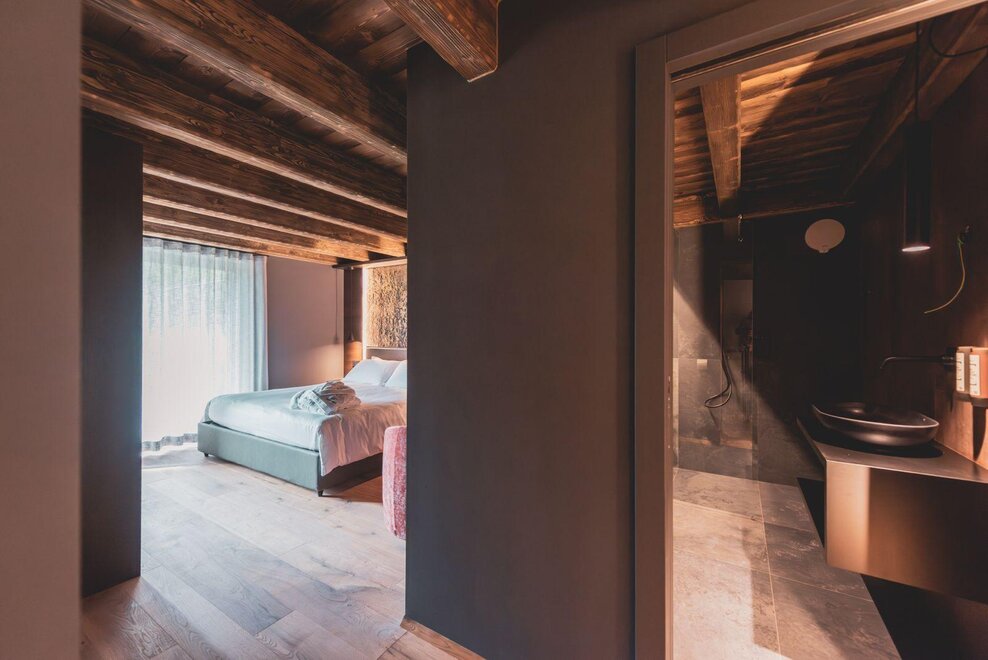 "Caelum": from Latin "sky", suggests a room with a breathtaking view of the mountain that seems to touch the clouds. The apartment, enveloped in wooden walls and warm fabrics in shades of cream and brown, welcomes with a natural and quiet elegance. A large terrace opens up to the landscape, like an invitation to breathe in the sky.