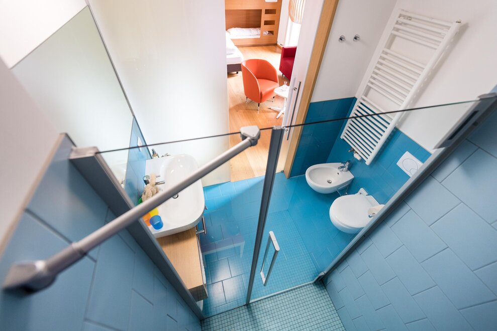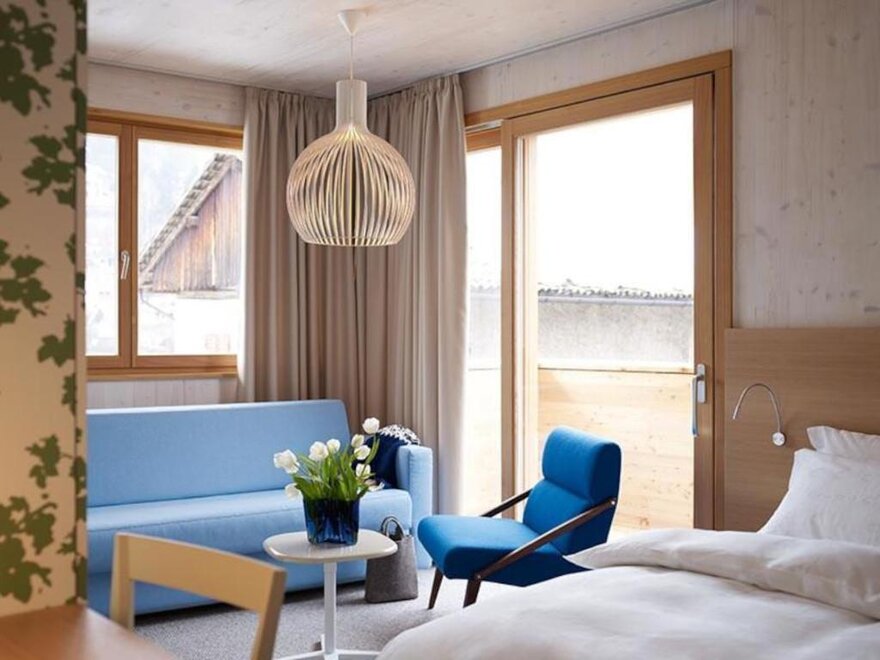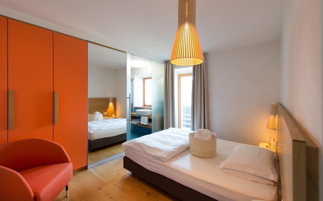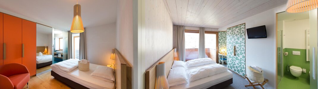 This solution for family or friends is the combination of the comfort room Margherita classic or the comfort room Margherita superior classic with the comfort room Tulip eco. With the door open you share and with the door closed everyone can enjoy their own colourful room in the orange version or in the solid wood version, modern and mountain tradition reinterpreted. A sustainable and plastic-free holiday in the right room.