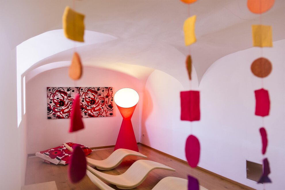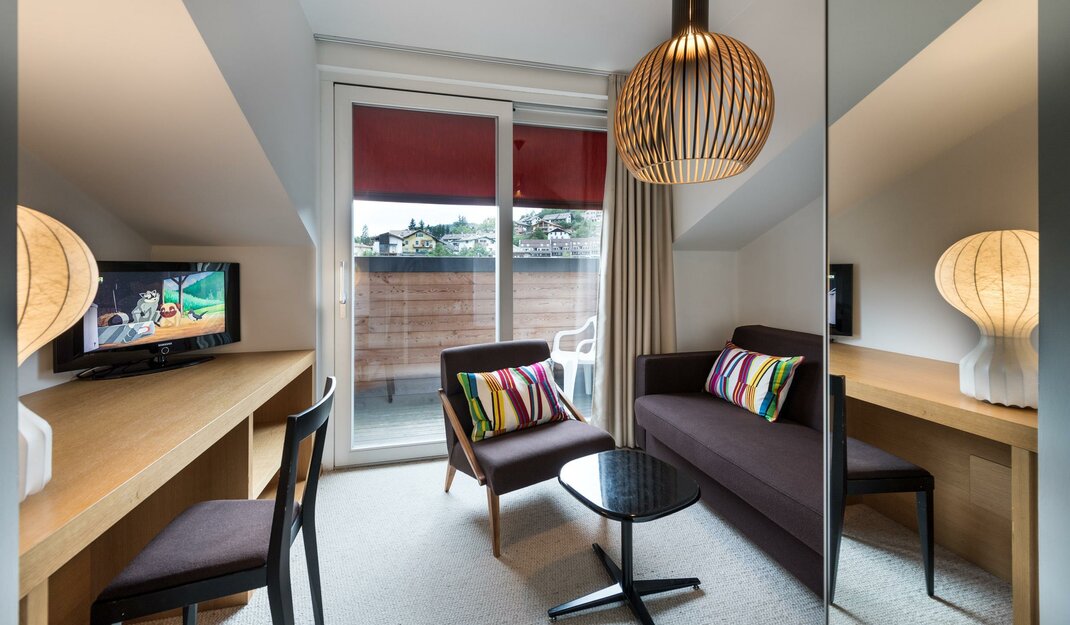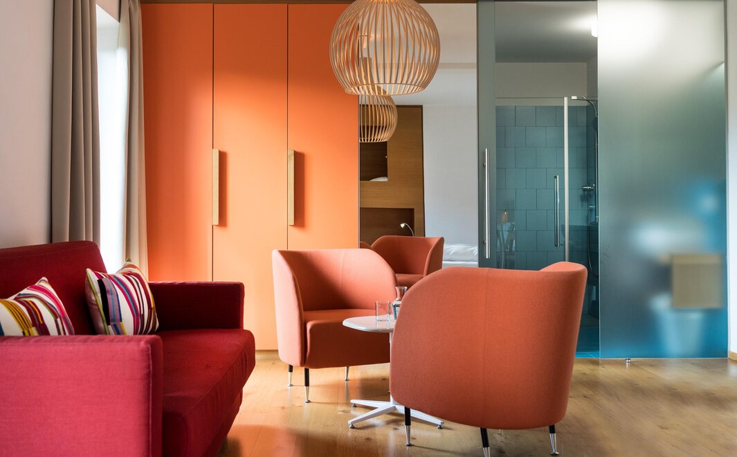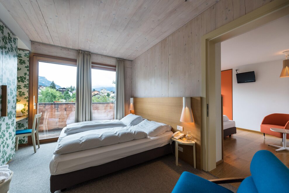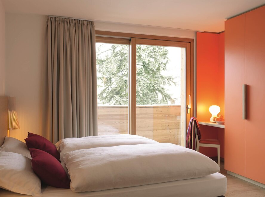 Like a colourful living room for the family. In this airy room with double access to the long west-facing balcony, you can let off steam in an alcove. The sun penetrates the room and illuminates the colours of the furniture, which range from orange to red. For children, there is an alcove bed or a sofa bed. The cushion is for those who prefer materials of plant origin. Extremely fresh and balsamic, the stone pine pampers you with its intense forest scent. From this room, the sunset is a spectacle.