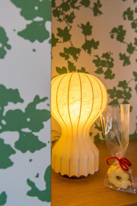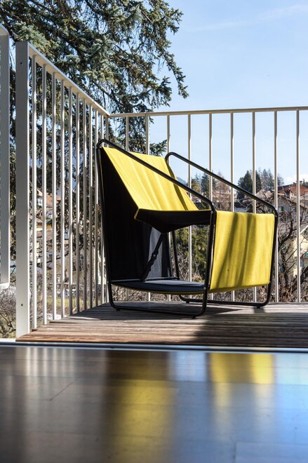 The room is very sunny with a view of the Cermis and Lagorai mountains. From the balcony you can enjoy the sun's rays from noon to sunset. The warm colours of the furniture and the light oak floor make the room very bright. The coat rack and coffee table belong to the old Azalea, a jump to the 1960s. A mini pillow made of mountain hay flowers welcomes you and gives off a pleasant, calming and restful scent.