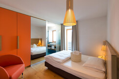 The single room is very bright and has a balcony facing west towards the vegetable gardens. The orange colour of the minimalist furnishings and the 140 cm wide French bed make for great relaxation. The floor is made of light oak wood. On the balcony you will find a comfortable deck chair where you can relax and sunbathe in the afternoon.