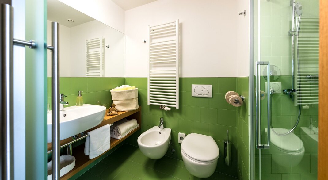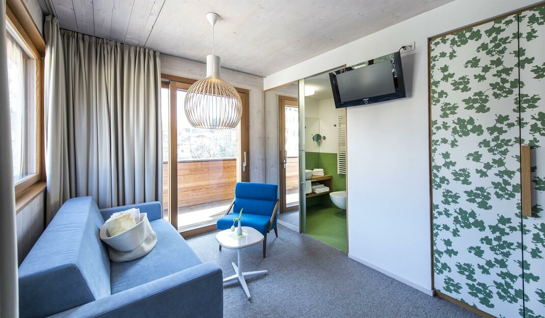 Overlooking the vegetable gardens of Cavalese, the room offers a rural view. Upon entering, you are greeted by the scents of untreated wood that permeate a light-filled environment. The green colour of the decorated furniture and the bathroom is predominant. Green gives tranquillity. The living room with its vintage armchair and sofa is ideal for relaxing with a book. The sofa can be transformed into a 140 cm wide bed. The floor is made of grey boiled organic wool, reminiscent of the South Tyrolean Sarner.