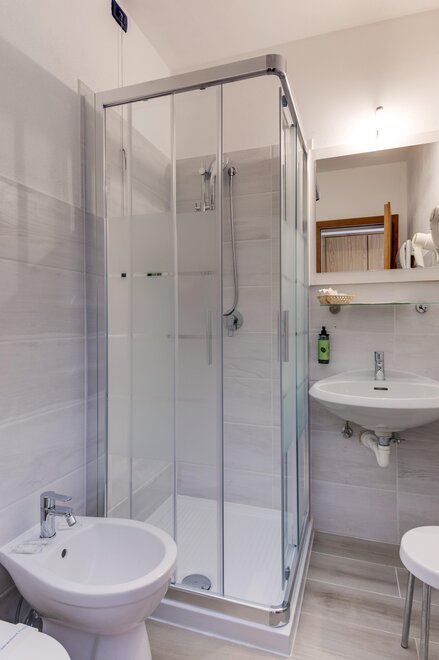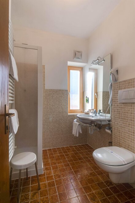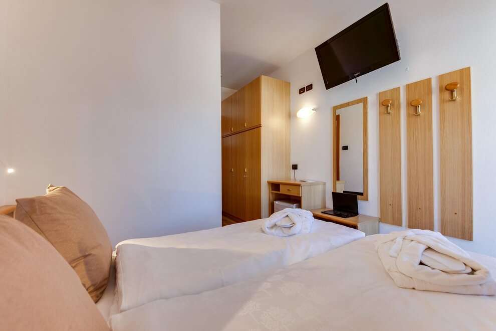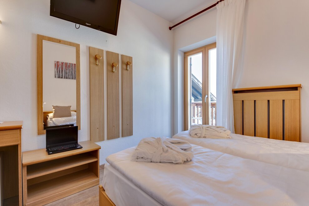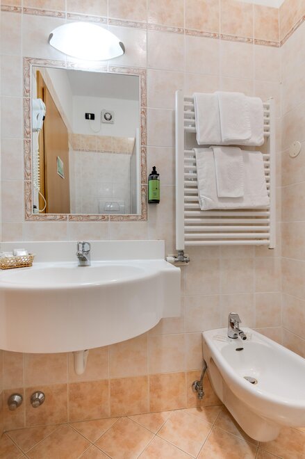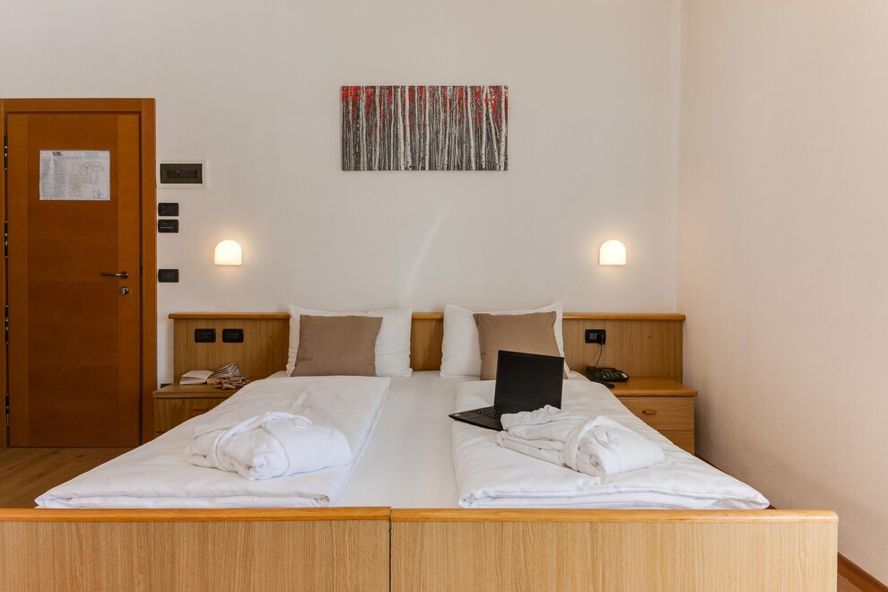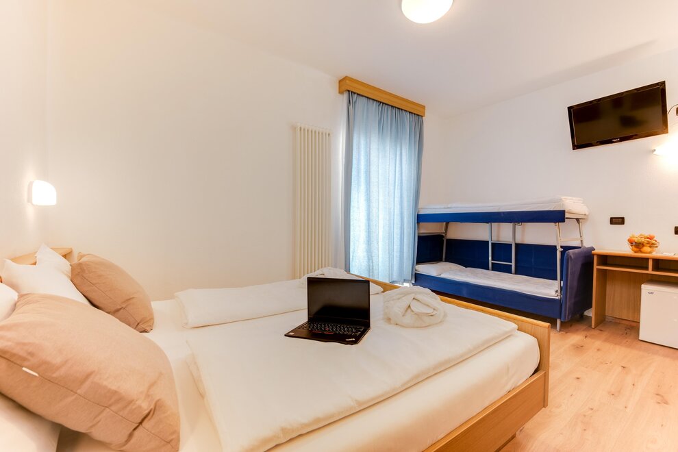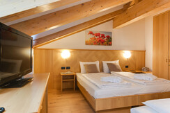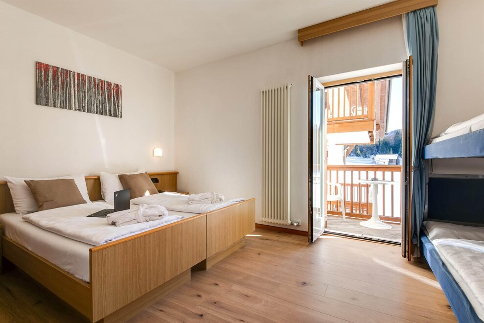Comfortable family room with double bed plus bunk bed settee, tastefully furnished in typical Alpine style, with views of the Dolomites, some with balcony. It has tv, wi-fi, minibar, private bathroom with shower and hairdryer.