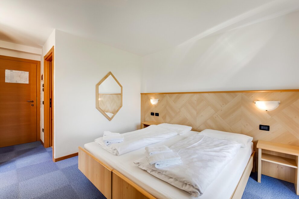 Comfortable room with large French bed, finely furnished in typical alpine style, with a view of the Dolomites, some with balcony. It is equipped with TV, wi-fi, minibar, private bathroom with shower and hairdryer.
