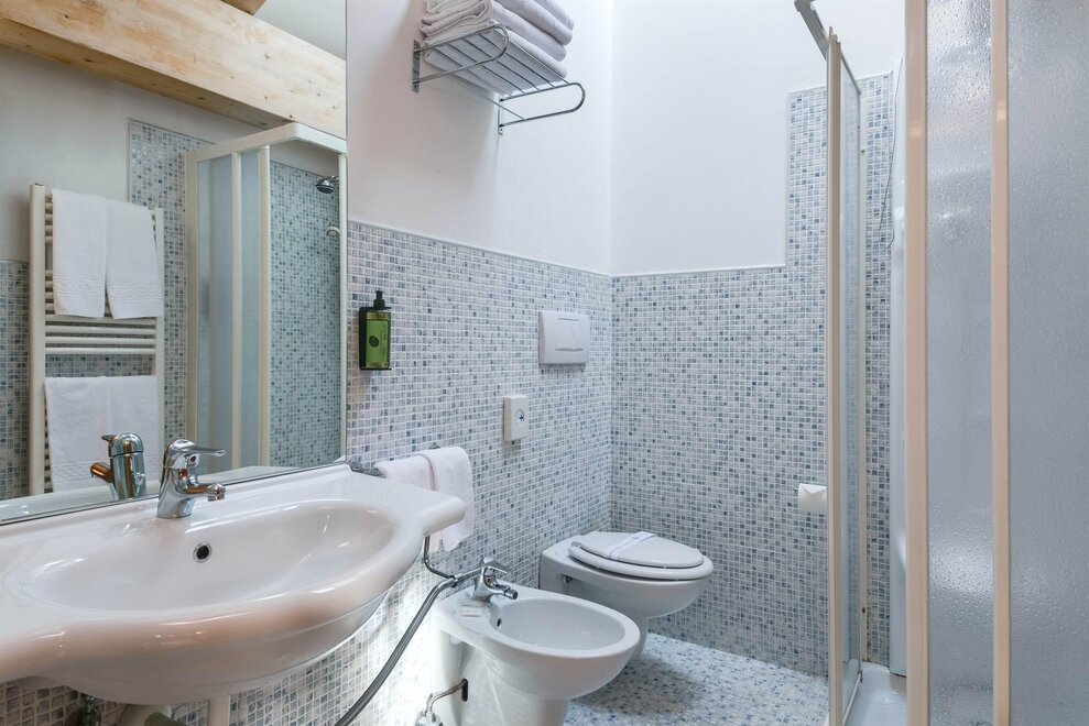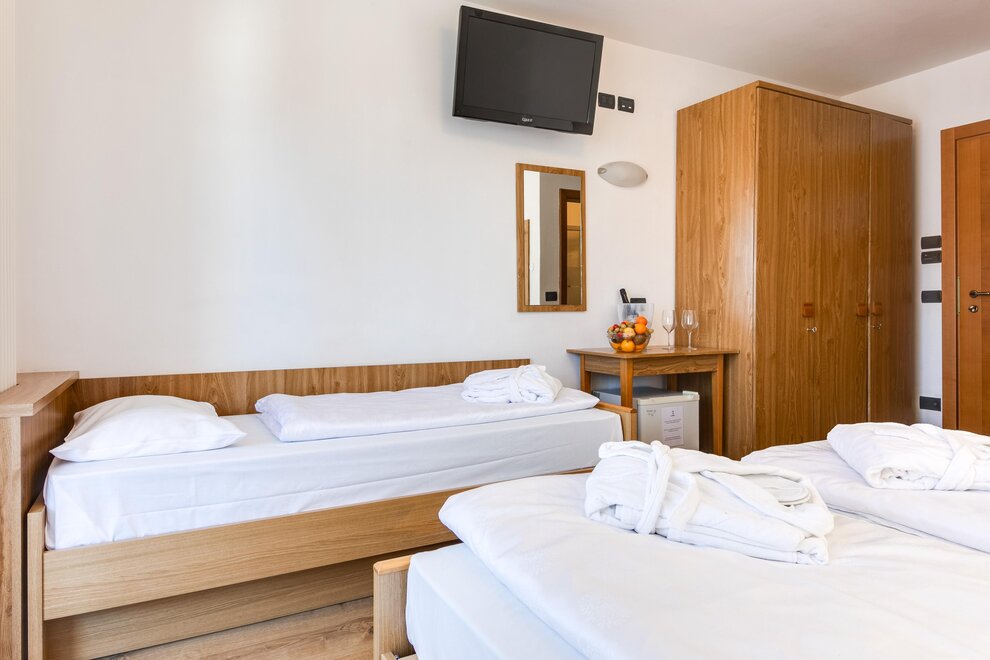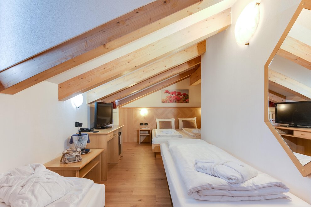 Comfortable family room with double bed plus two single beds, finely furnished in typical Alpine style, with a view of the Dolomites. It has tv, wi-fi, minibar, private bathroom with shower and hairdryer.