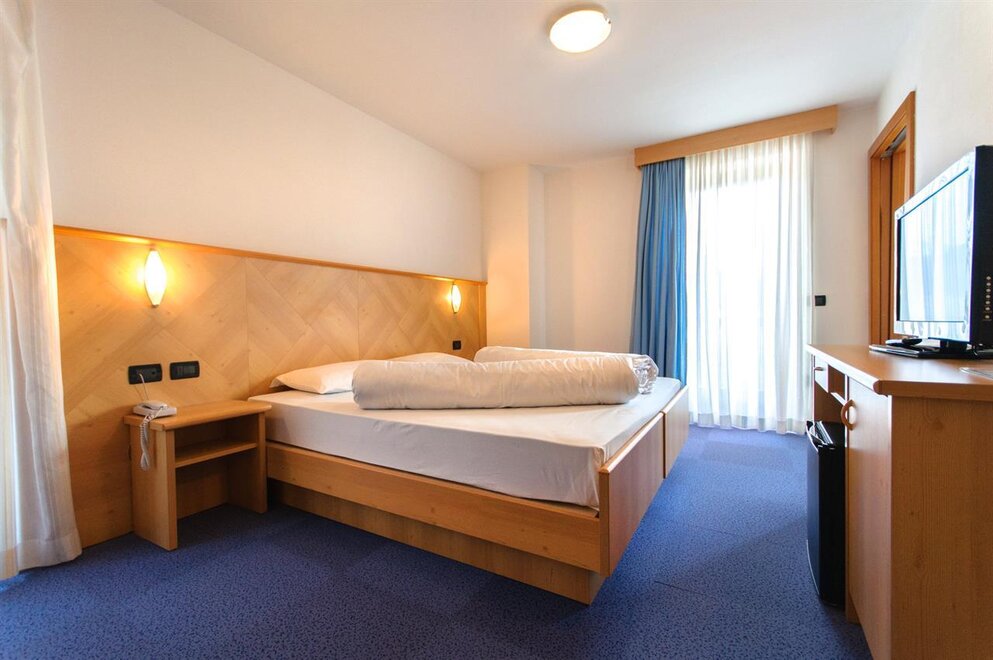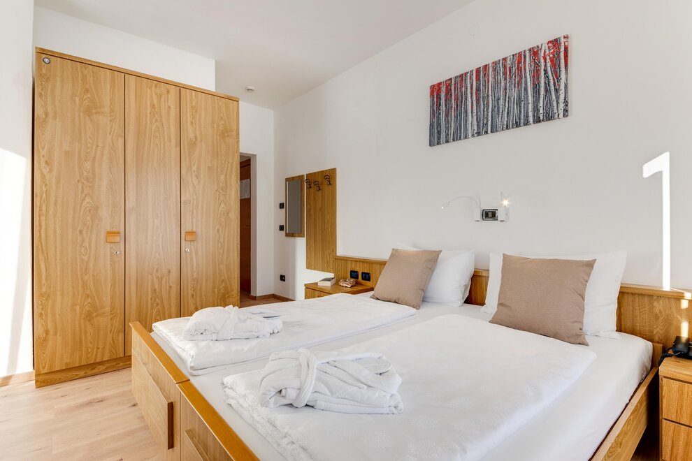 Comfortable double room with double bed or two single beds, finely furnished in typical alpine style, with a view of the Dolomites, some with balcony. It is equipped with TV, wi-fi, minibar, private bathroom with shower and hairdryer.