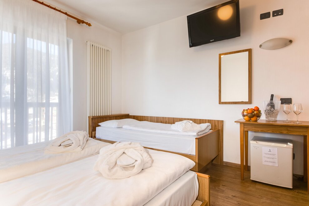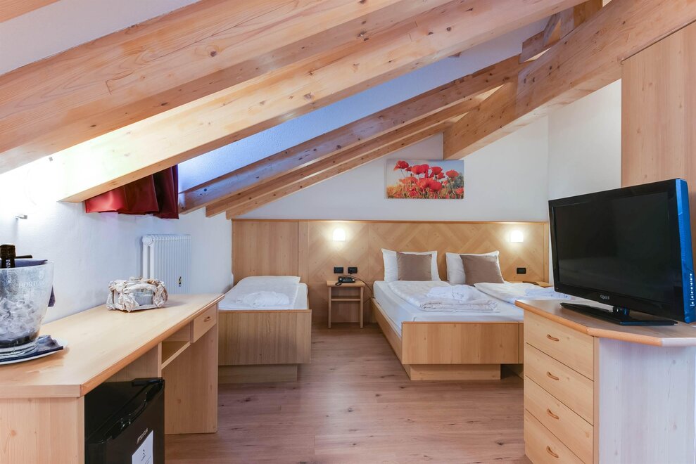 Comfortable triple room with double bed plus single bed or three single beds, finely furnished in typical alpine style, with a view of the Dolomites, some with balcony. It has tv, wi-fi, minibar, private bathroom with shower and hairdryer.