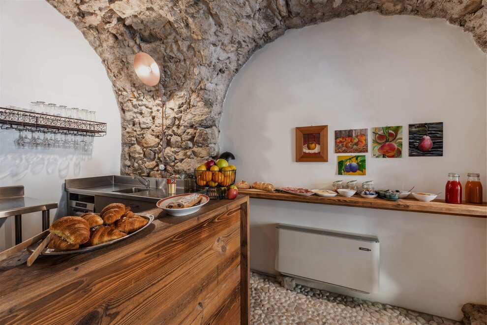 Typical apartment with kitchenette, with characteristic stone vaulted ceilings original from the 1700s. Furniture in pine and historical wrought iron double bed from '800. Bathroom with window. Matresses Dorelanbed.