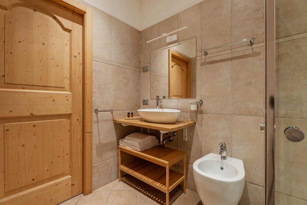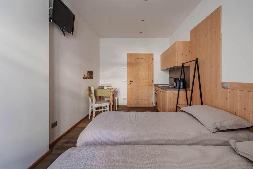 Cornetto is an apartment for three people with natural spruce furnishings and oak wood floor. Equipped with two single beds with Dorelan Myform mattress, a kitchenette, a large bathroom with window, a single room with a French bed and an additional bathroom.