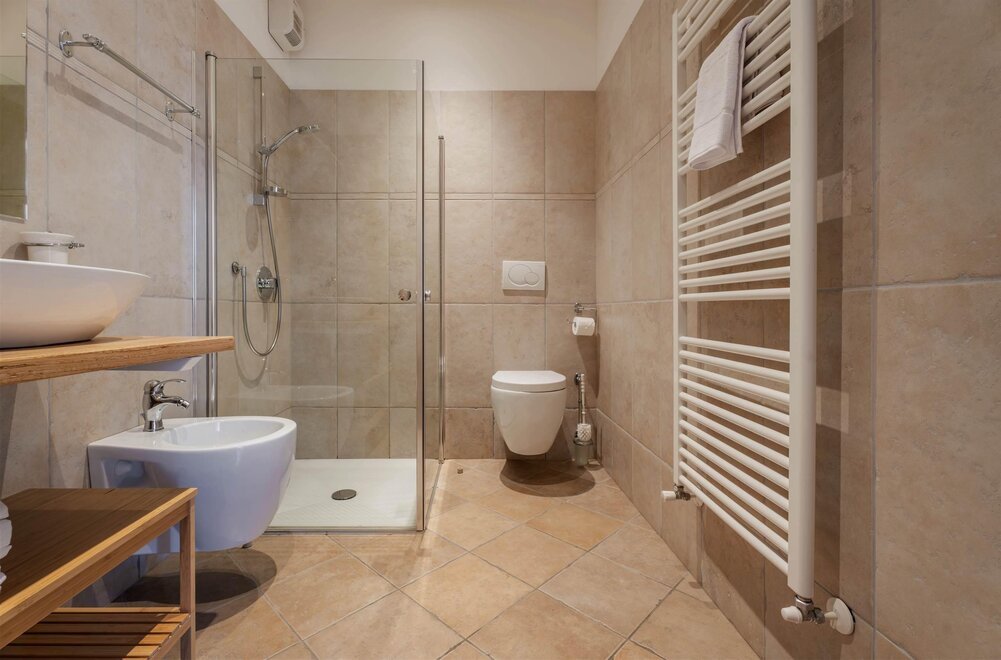 Organic toiletries bathroomApartment with kitchenette, LCD TV with SAT channels, private entrance, free Wi-Fi, terrace furnished with table and chairs overlooking the historic center of Pietramurata. Hairdryer, fridge, safe box. Laundry service (for a fee) and bicycles available.