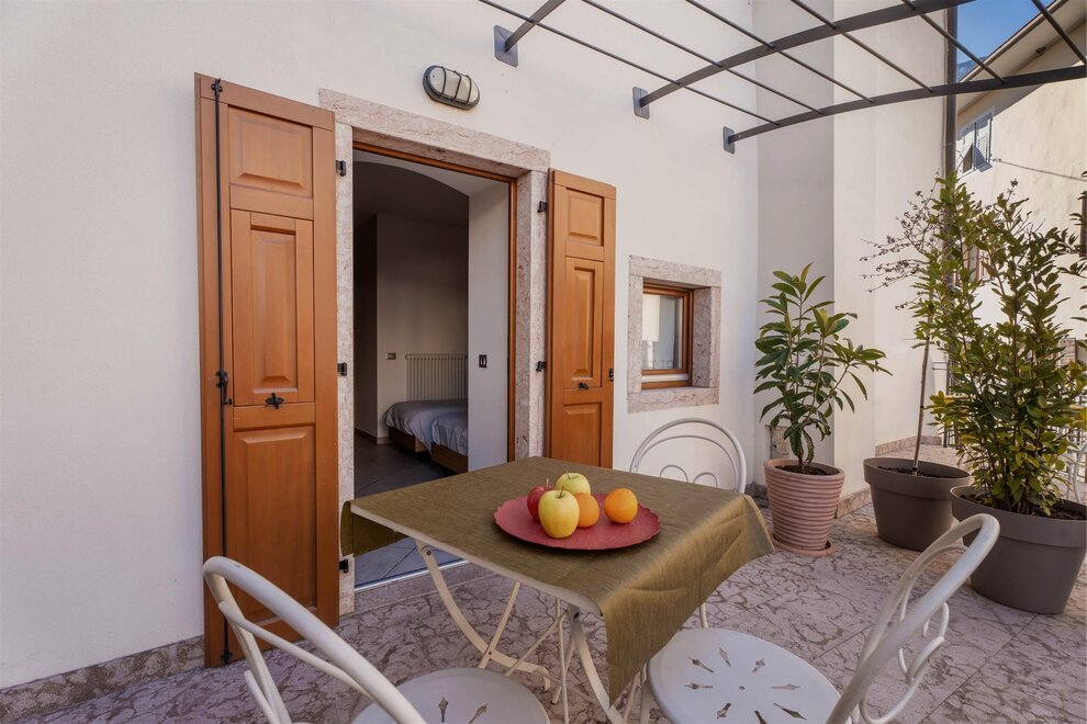 Casale is a romantic apartment with double bedroom with a bed and a picturesque terrace overlooking the old town with a small marble table and iron chairs wrought.