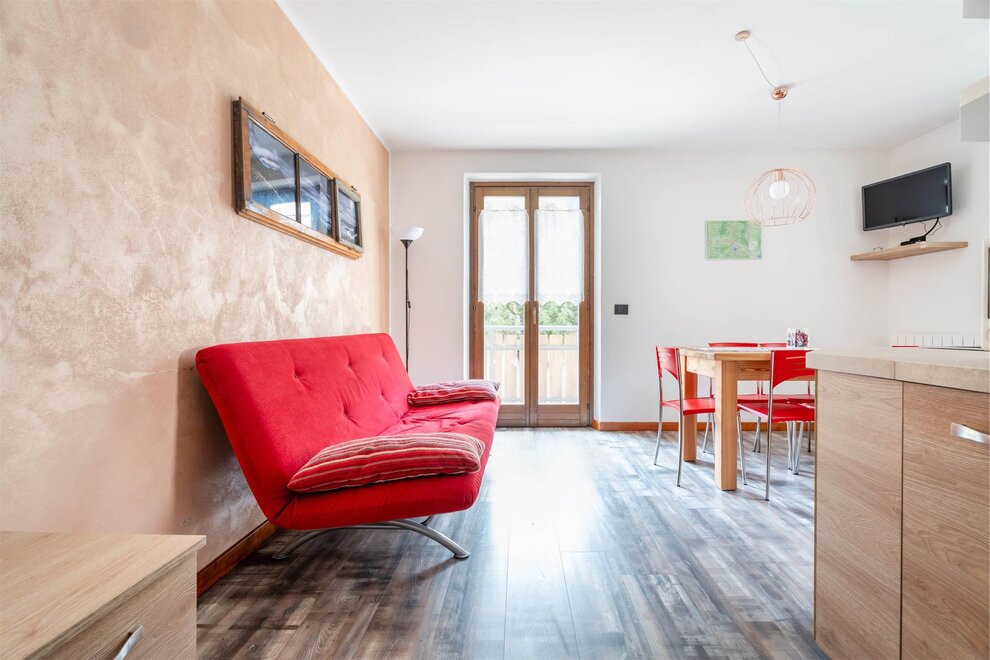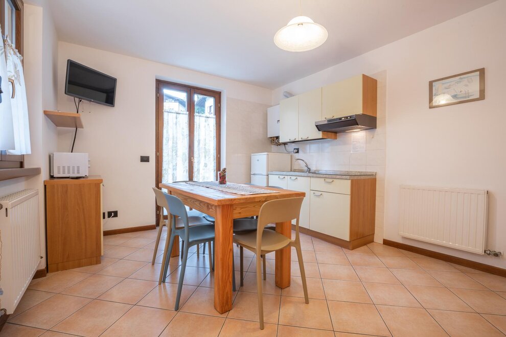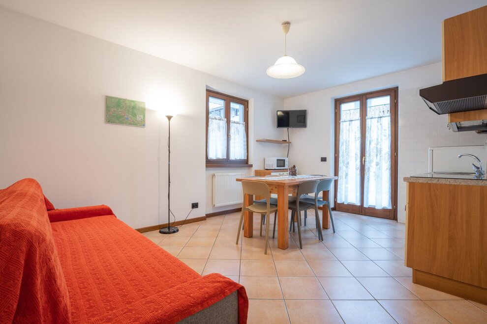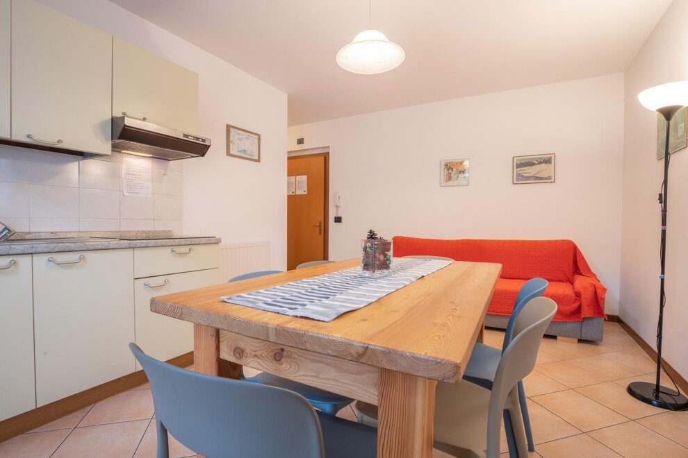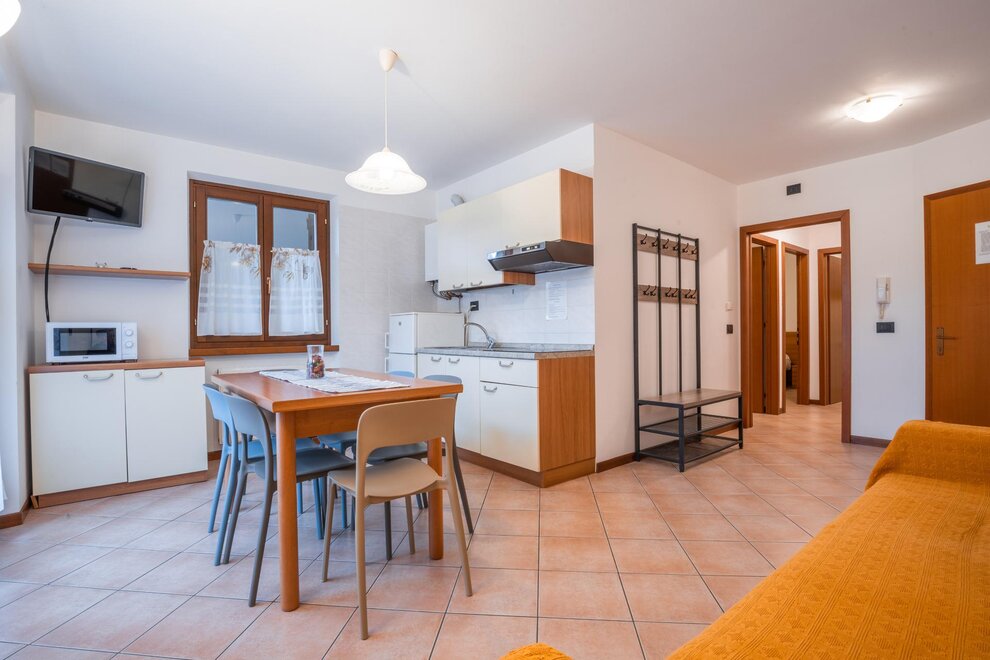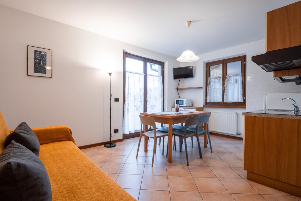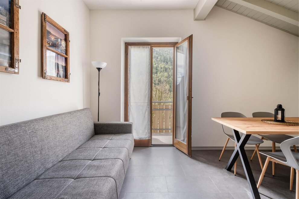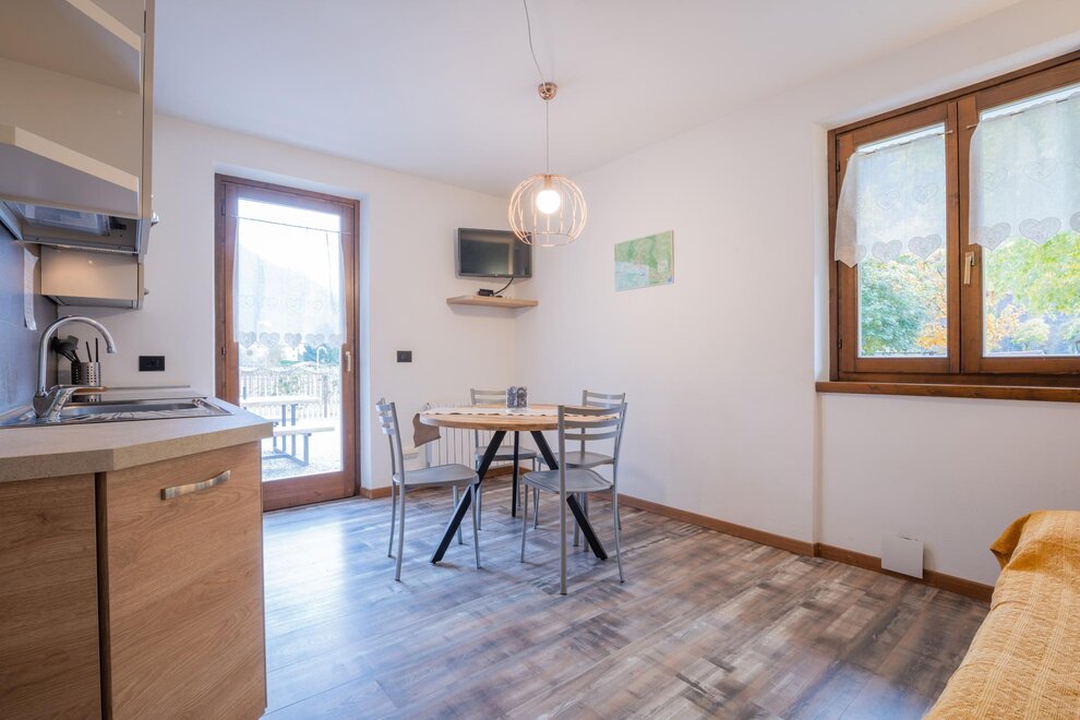It includes a living room with a fully-equipped kitchen, a double bedroom, a bedroom with two single beds and a double sofa bed in the living area, accommodating up to 6 guests. The ground floor apartment has a patio for private use, while apartments on the first and second floors have a balcony with a small table, to enjoy the beautiful panorama over the Ledro valley mountains.