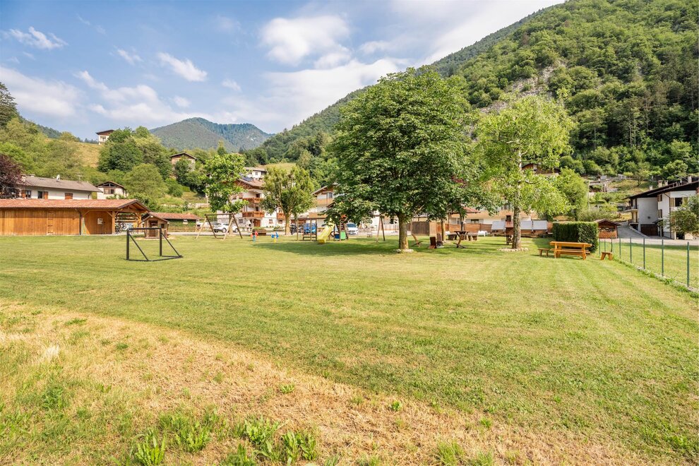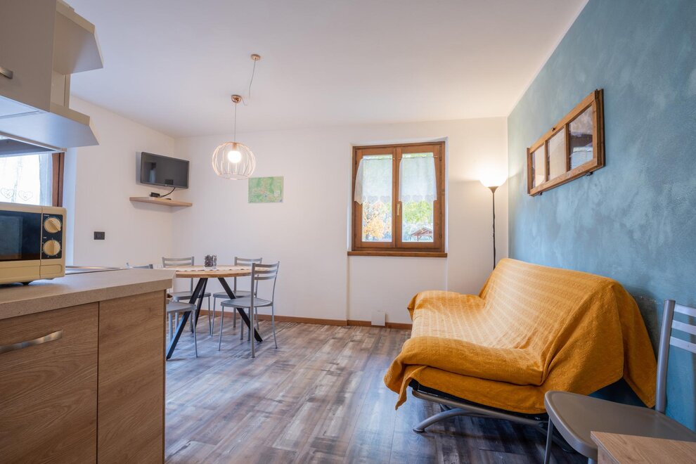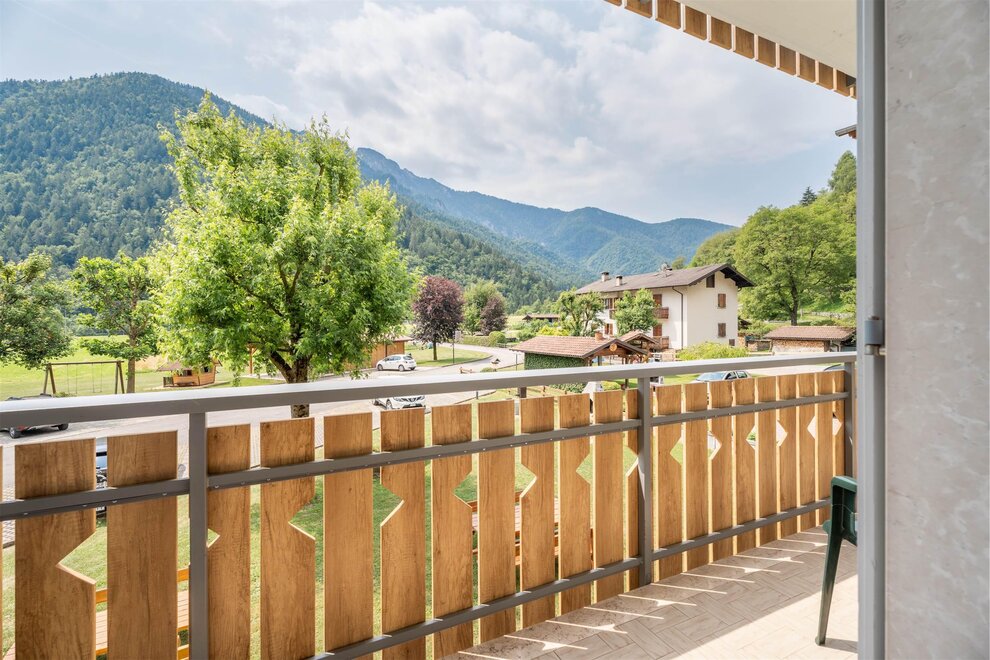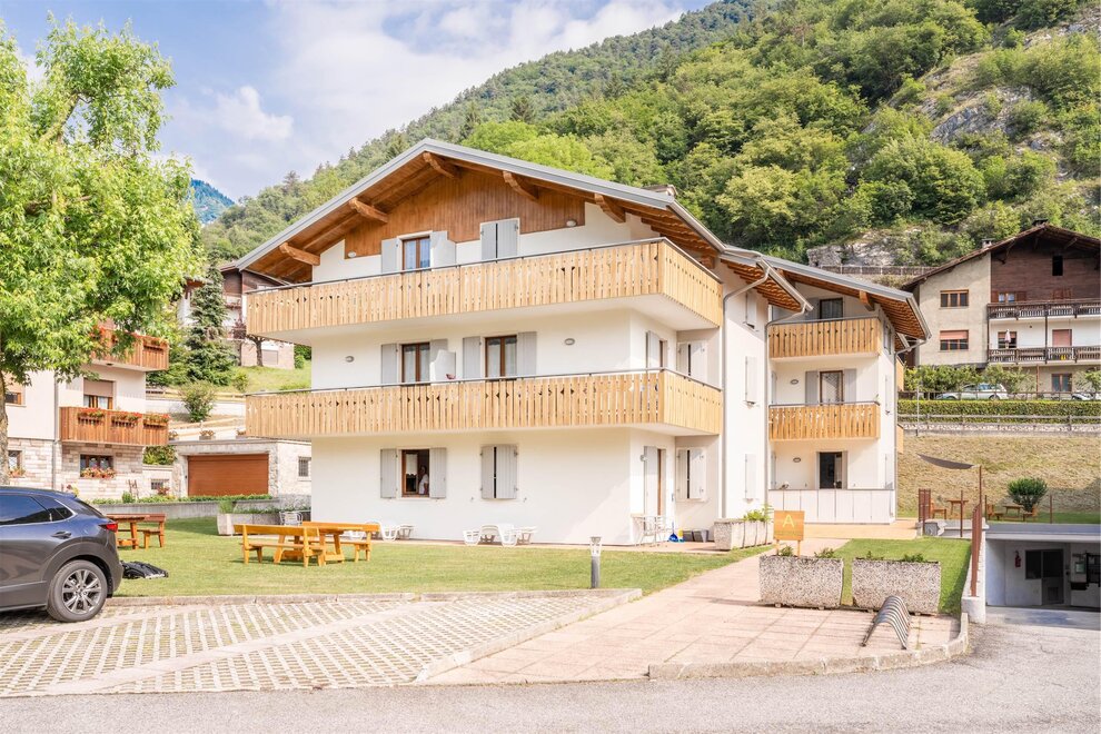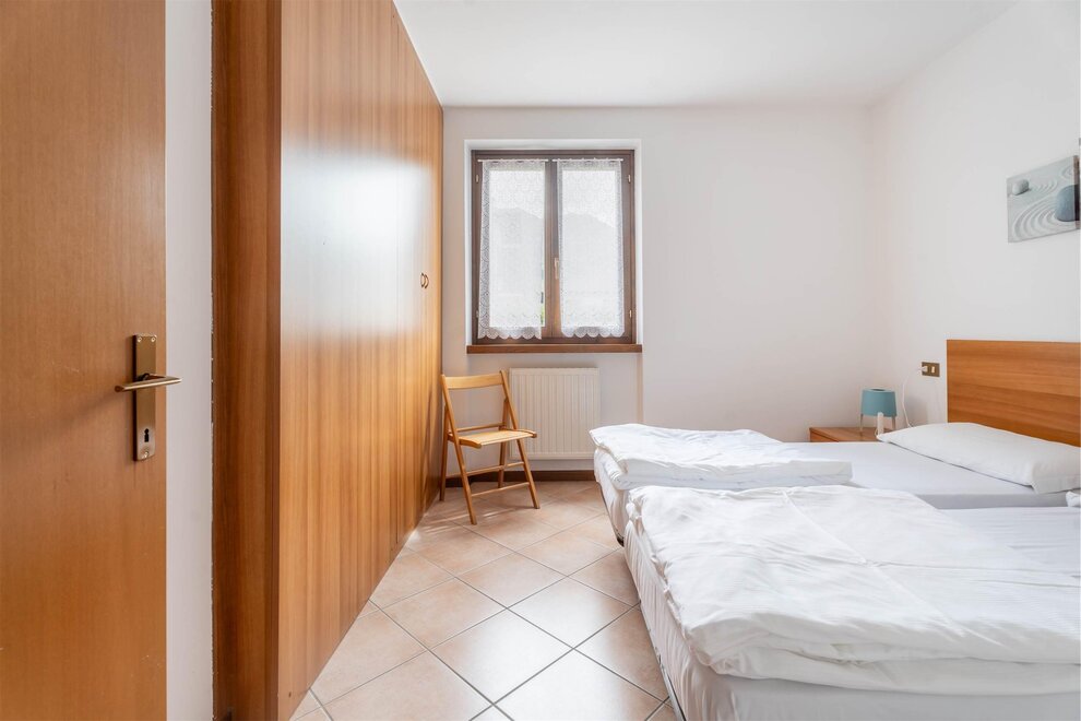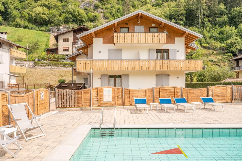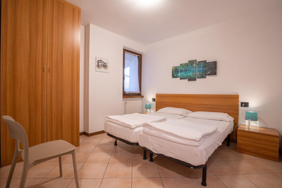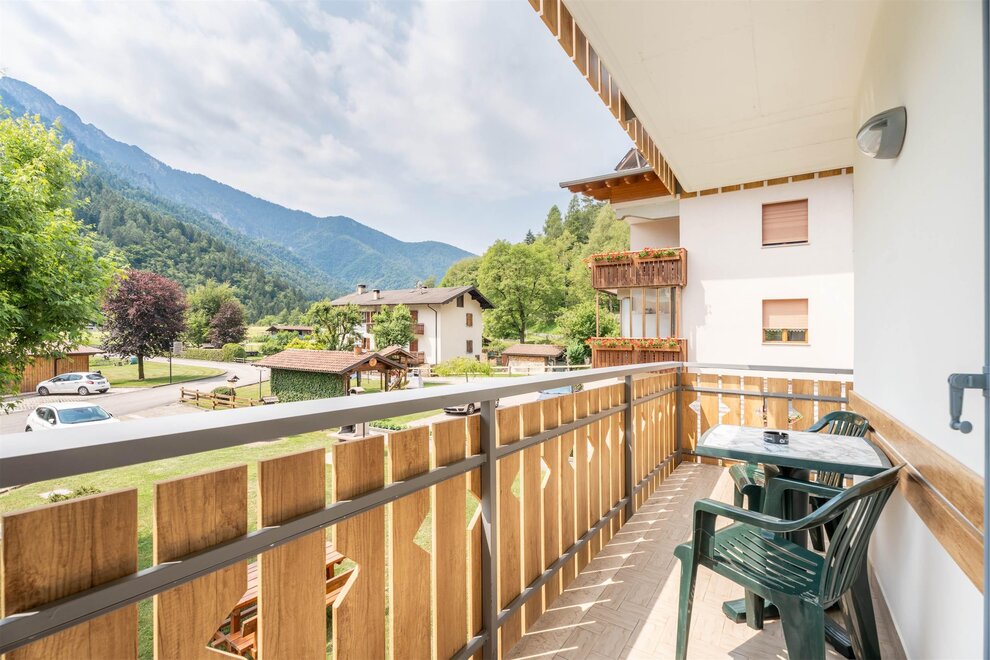 It includes a living room with a fully-equipped kitchen, a double bedroom, a bedroom with two single beds and a double sofa bed in the living area, accommodating up to 6 guests. The ground floor apartment has a patio for private use, while apartments on the first and second floors have a balcony with a small table, to enjoy the beautiful panorama over the Ledro valley mountains.