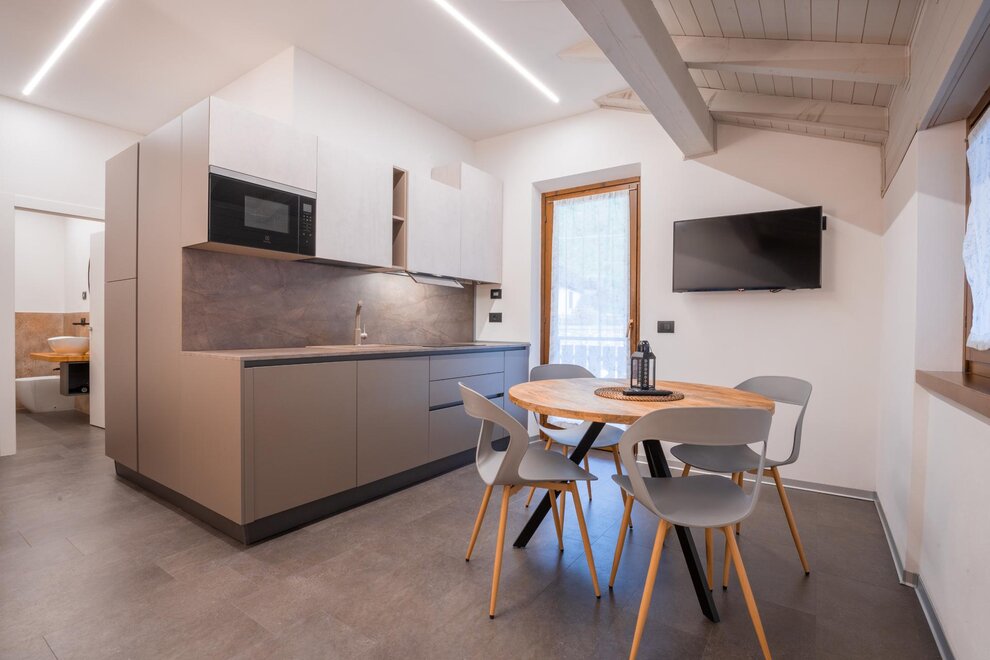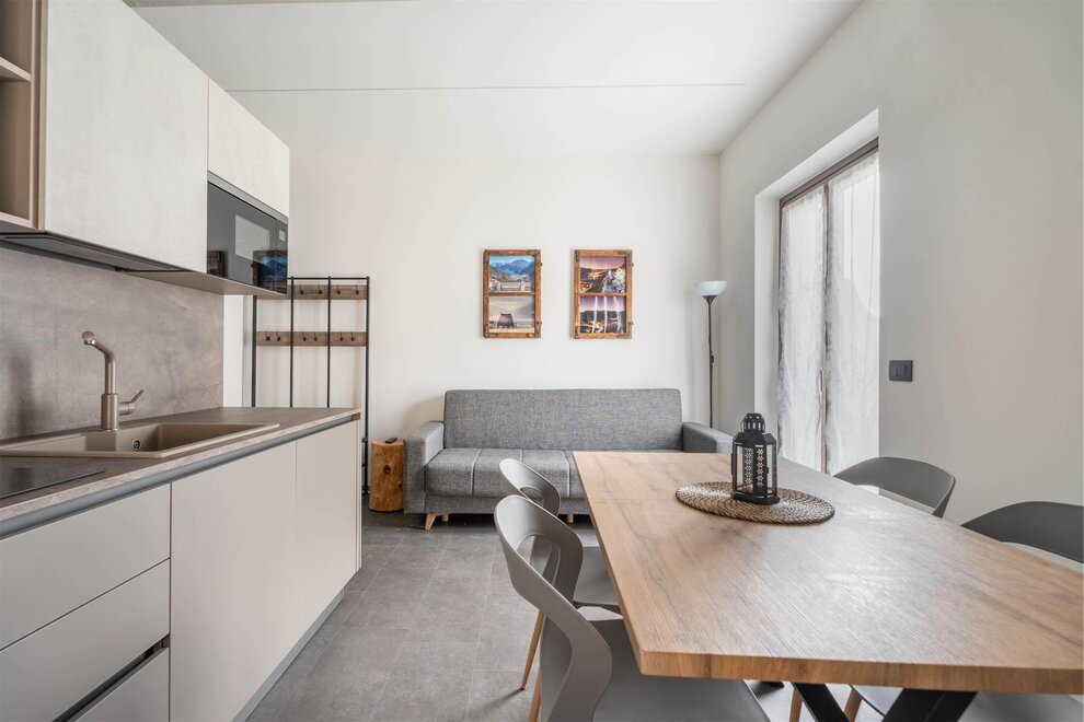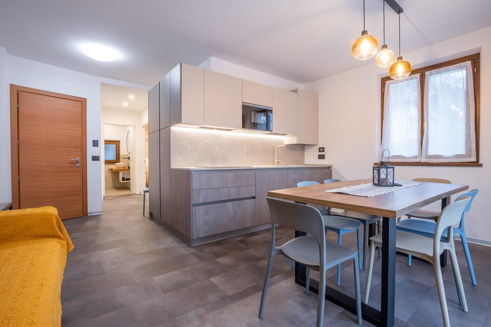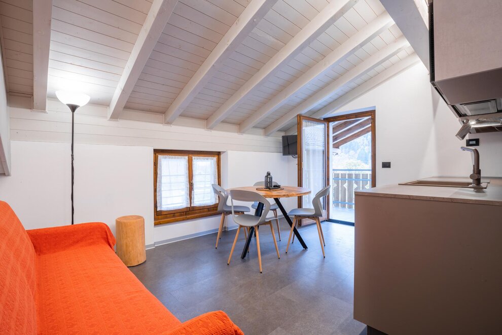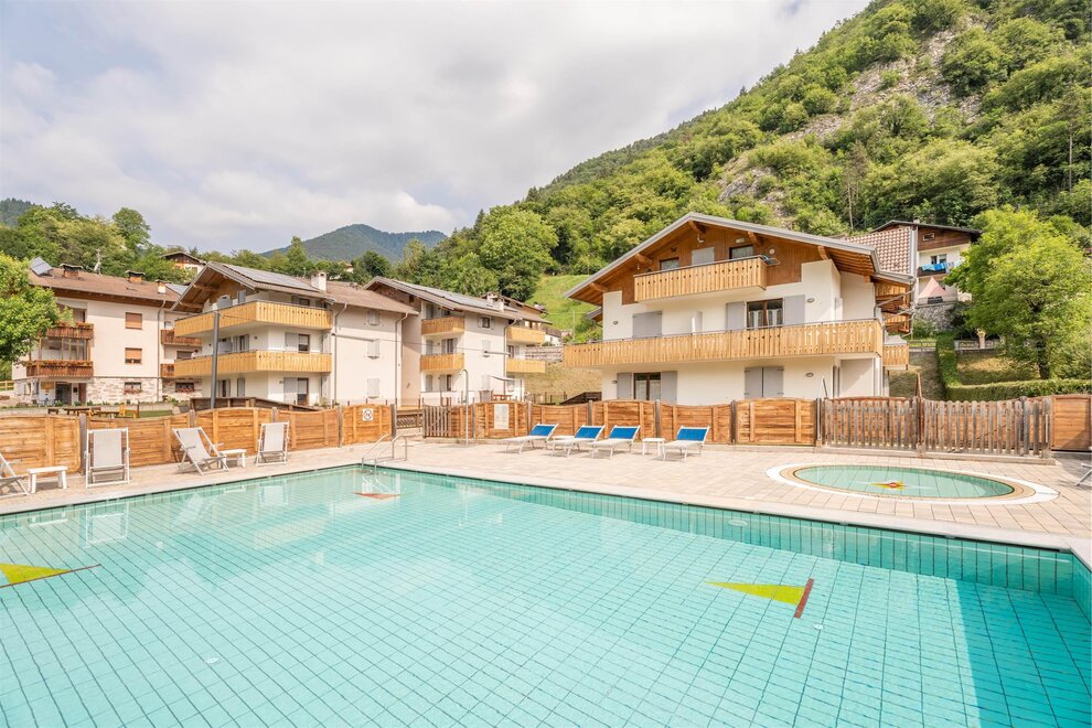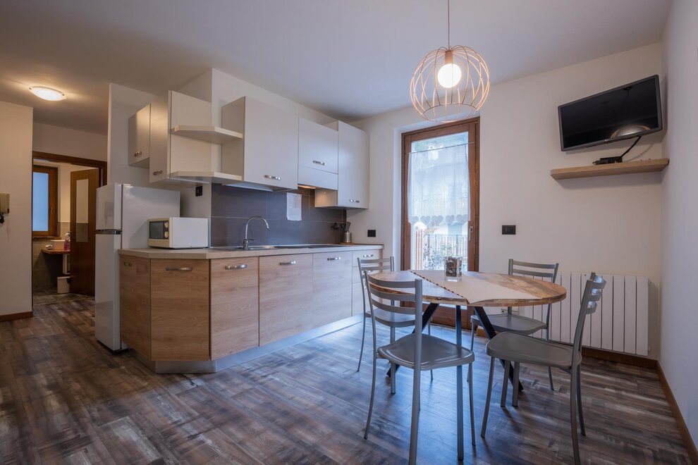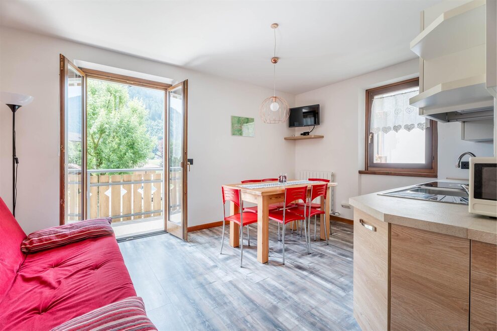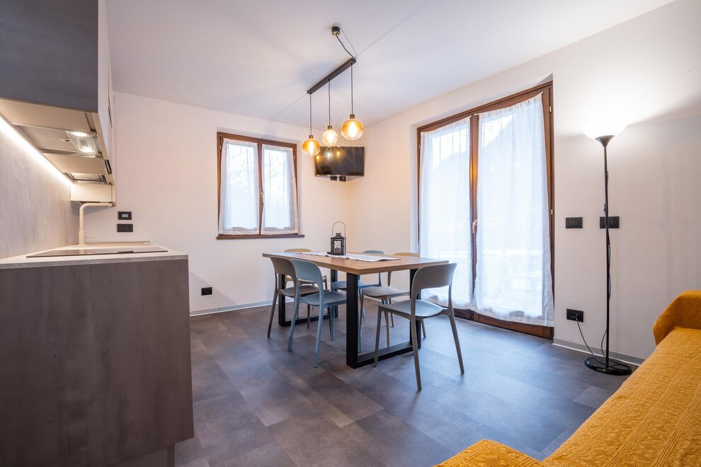 It includes a living room with a fully-equipped kitchen, a double bedroom, a bedroom with two single beds and a double sofa bed in the living area, accommodating up to 6 guests. The ground floor apartment has a patio for private use, while apartments on the first and second floors have a balcony with a small table, to enjoy the beautiful panorama over the Ledro valley mountains.