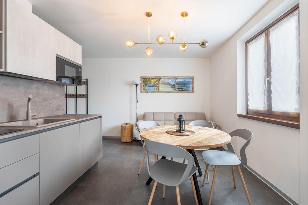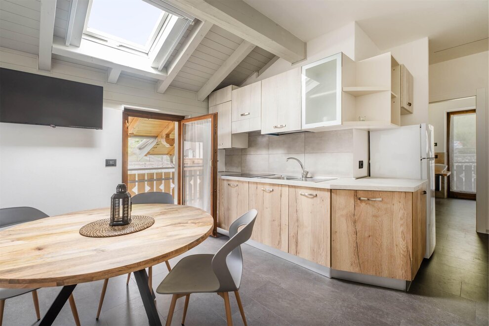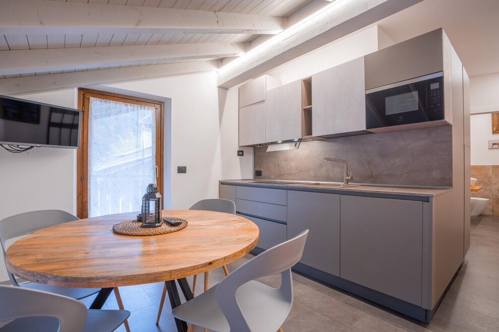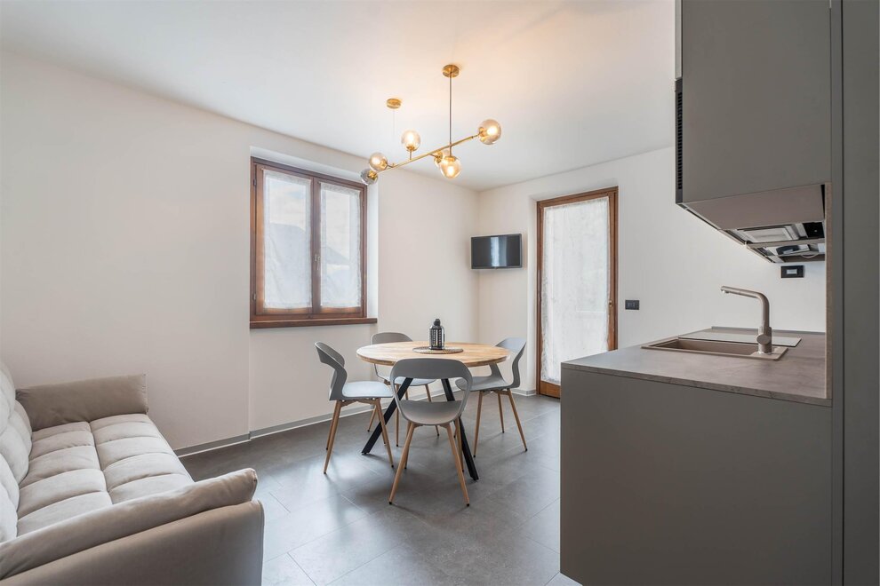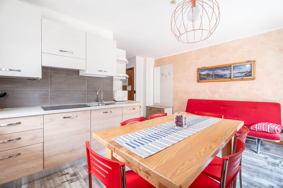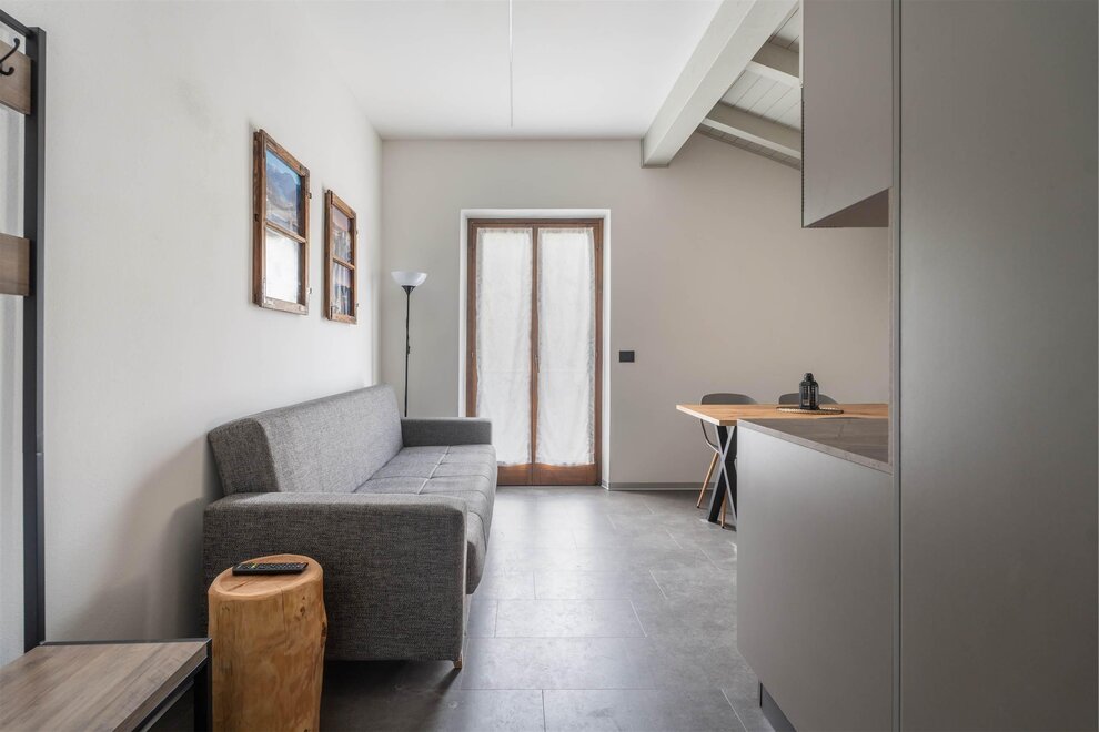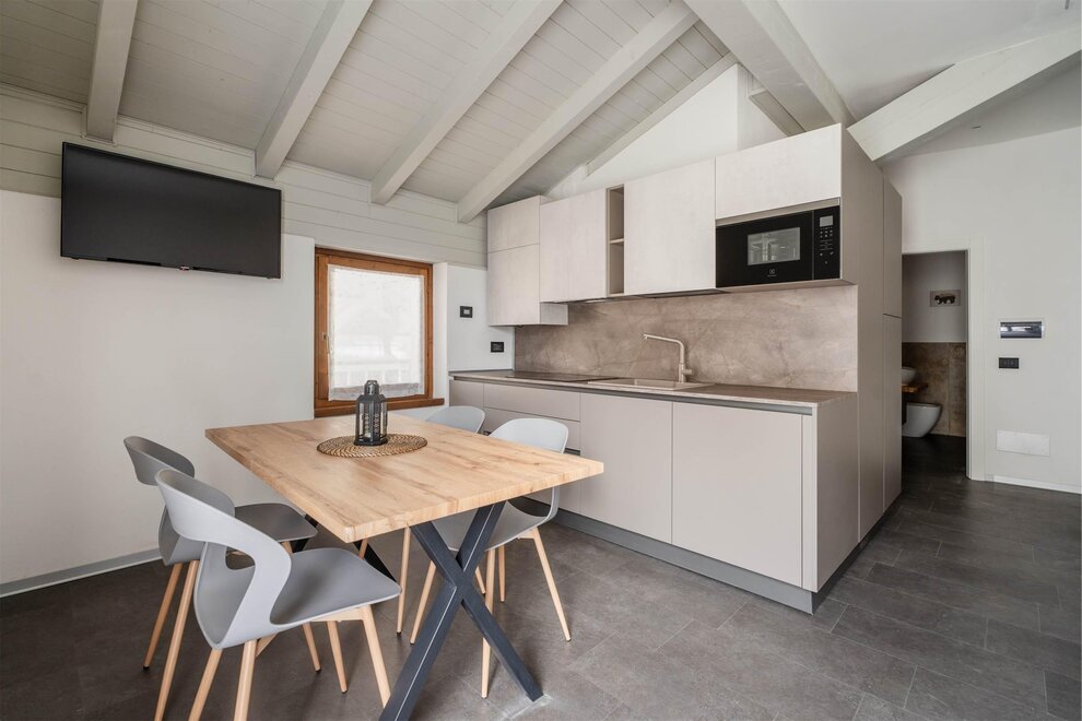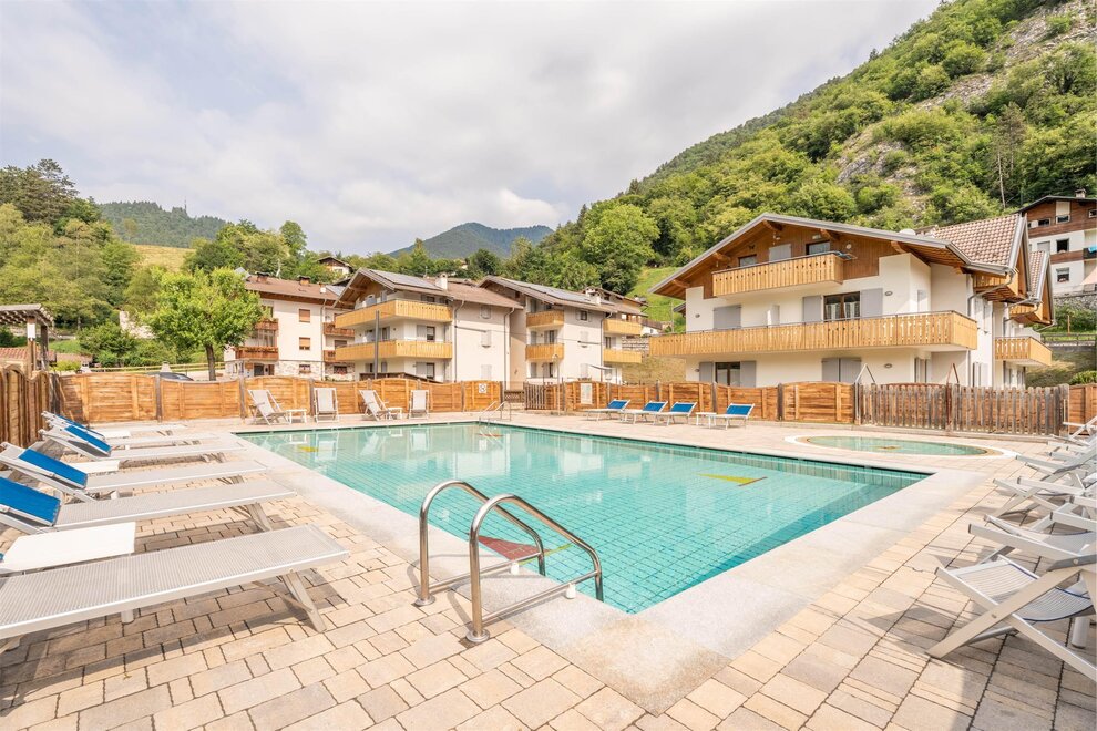 It includes a living room with a fully-equipped kitchen, a double bedroom, a bedroom with two single beds and a double sofa bed in the living area, accommodating up to 6 guests. The ground floor apartment has a patio for private use, while apartments on the first and second floors have a balcony with a small table, to enjoy the beautiful panorama over the Ledro valley mountains.