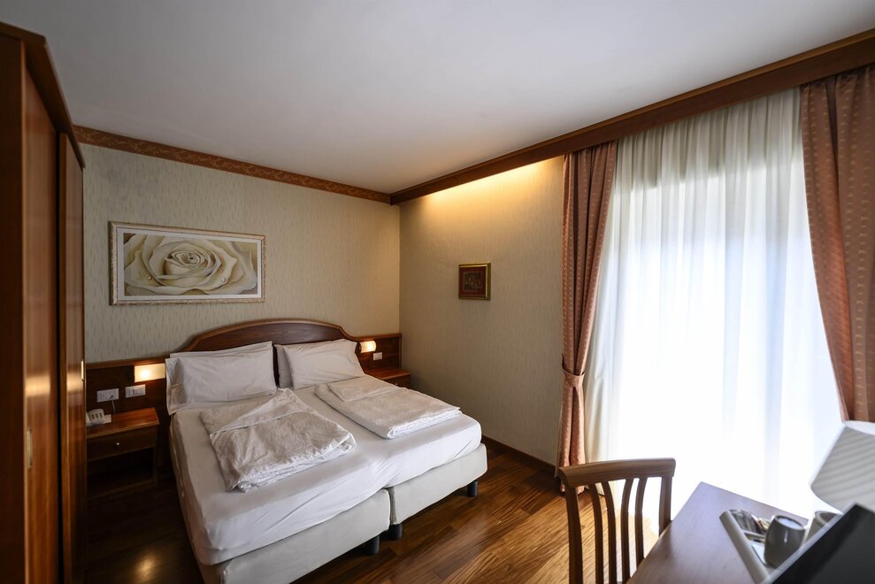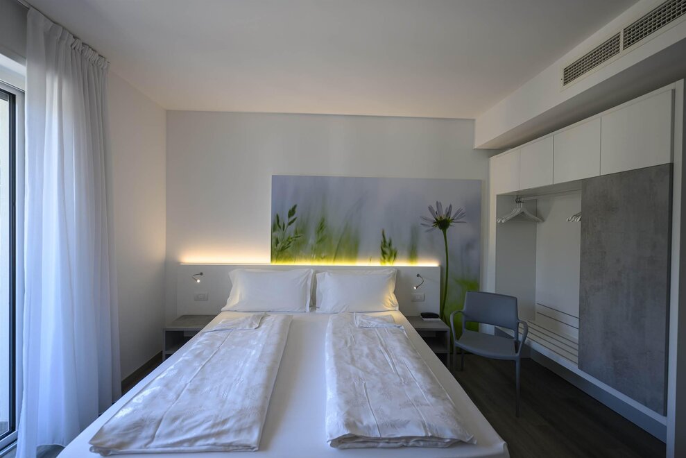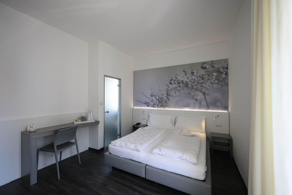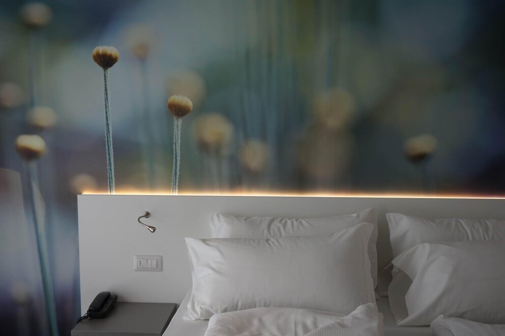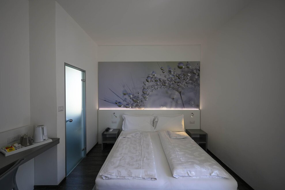 Relax yourself on the comfortable and large bed with a particular picture on the headboard. These rooms have every comfort you need.