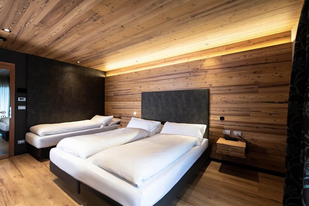 Enter our Classic Family (16-19m²), recently renovated, with warm larch wood from Trentino. It offers a rejuvenating shower with side hydromassage jets, cozy beds with memory foam toppers, and a balcony with mountain views, along with fast Wi-Fi: the perfect place for your holiday in Moena.