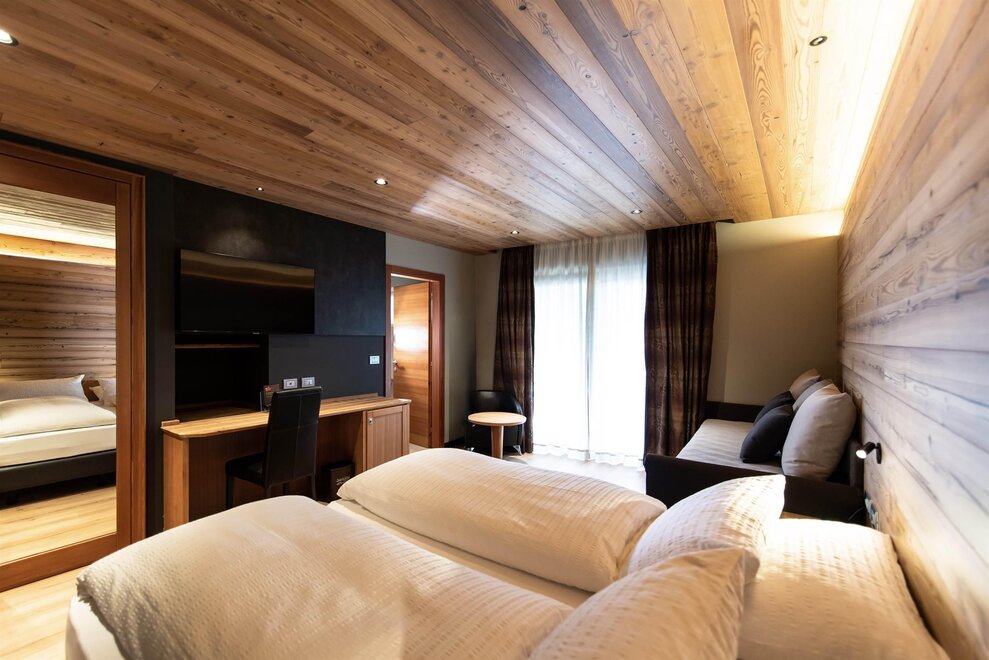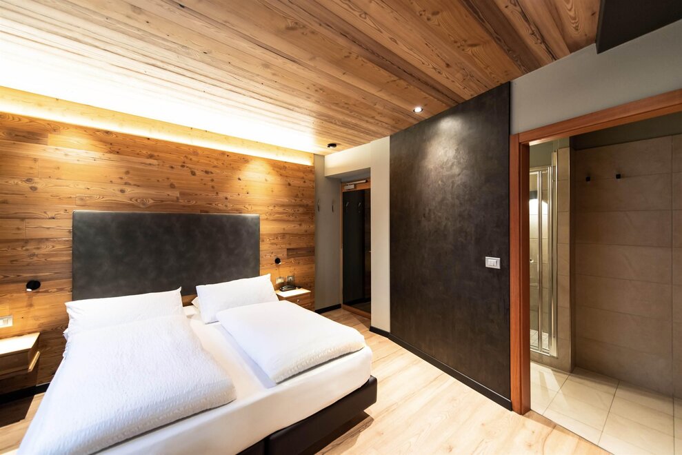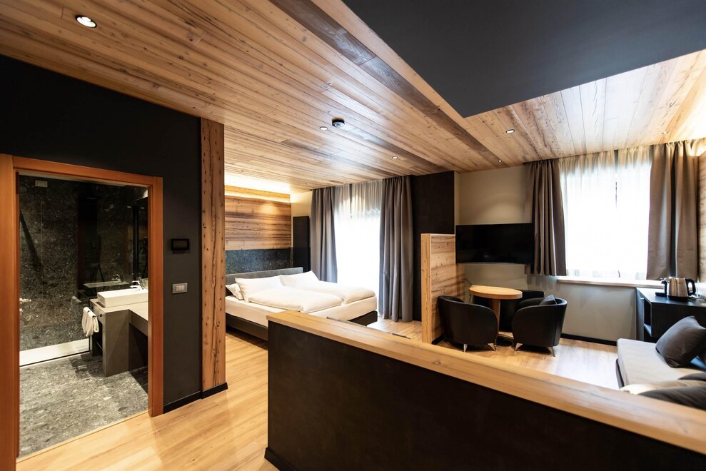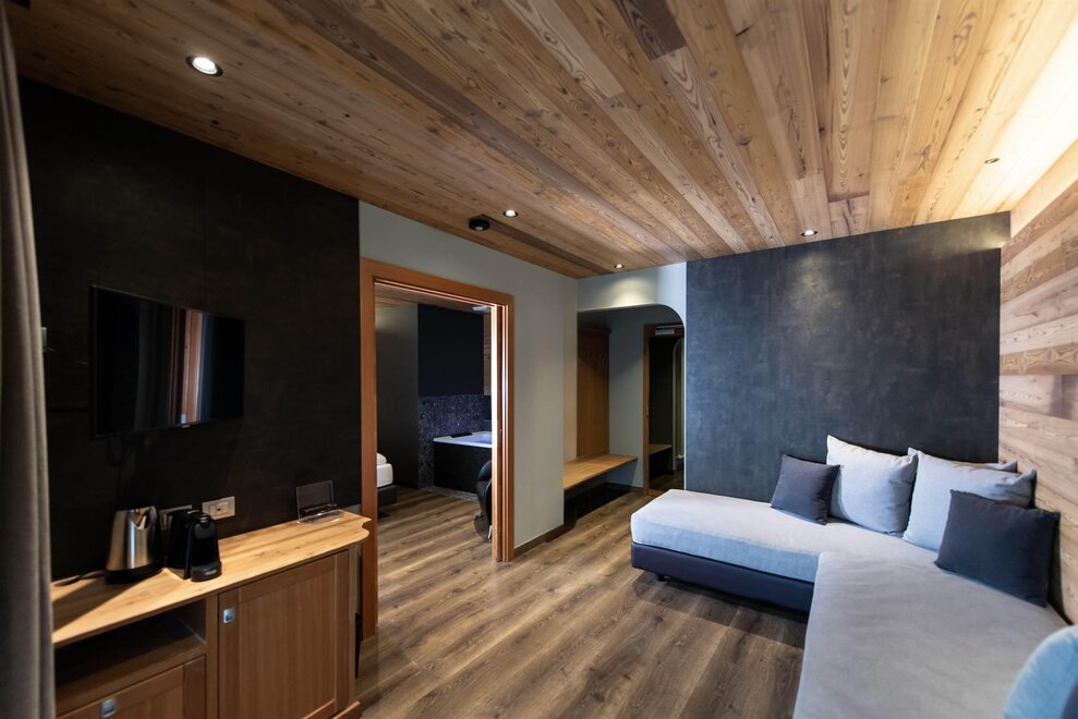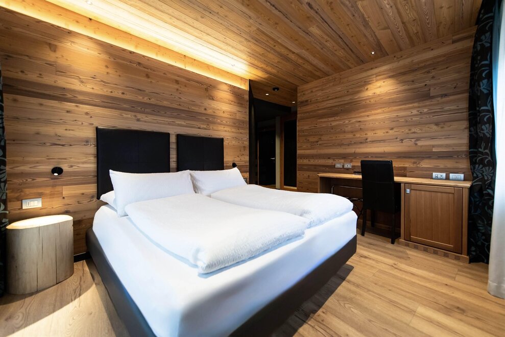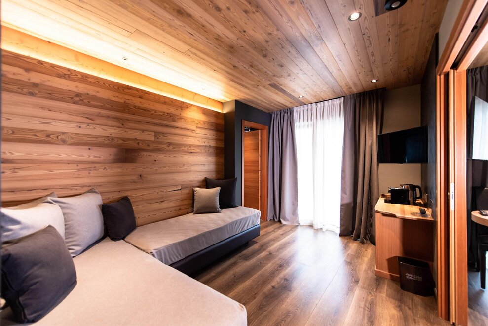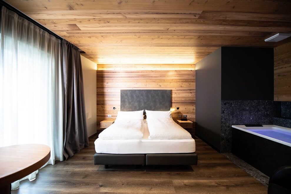 Immerse yourself in the warmth of our Junior Suite (36m²), newly renovated, dominated by larch wood from Trentino that makes it unique. Spacious, with an XL hot tub for 2 people in the room, shower with side hydrojets, comfortable beds with memory foam toppers, balcony with mountain views, and fast Wi-Fi, it is a Premium retreat, perfect for those seeking the best from their vacation.