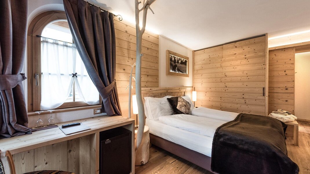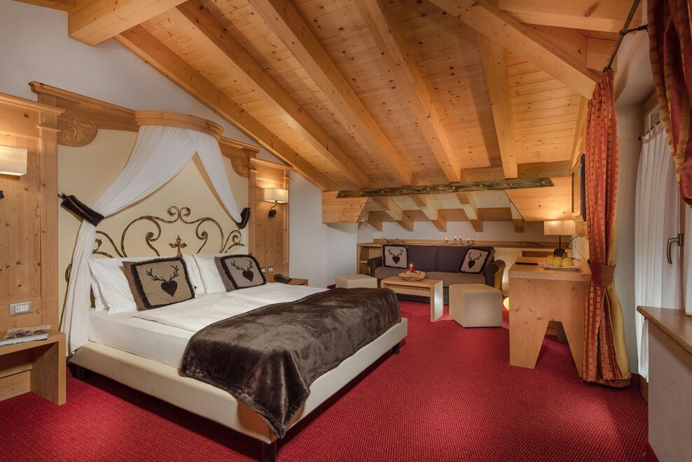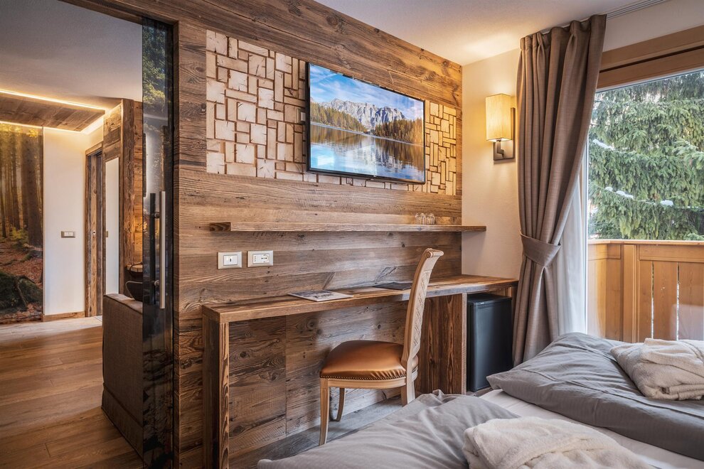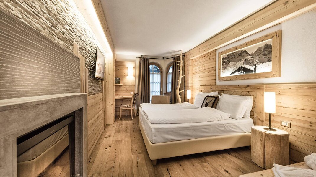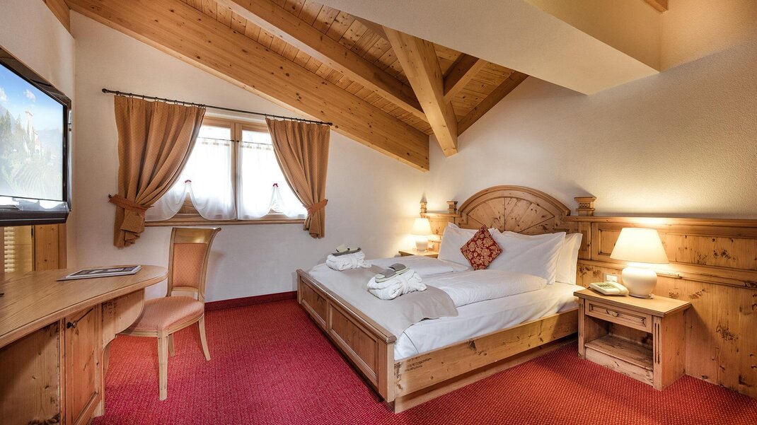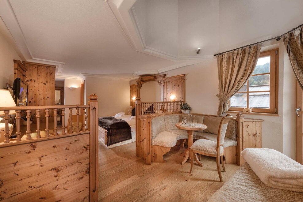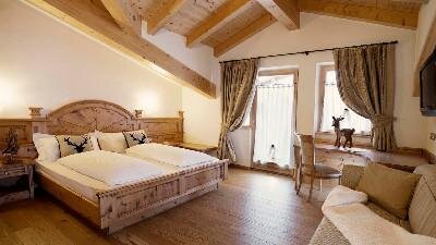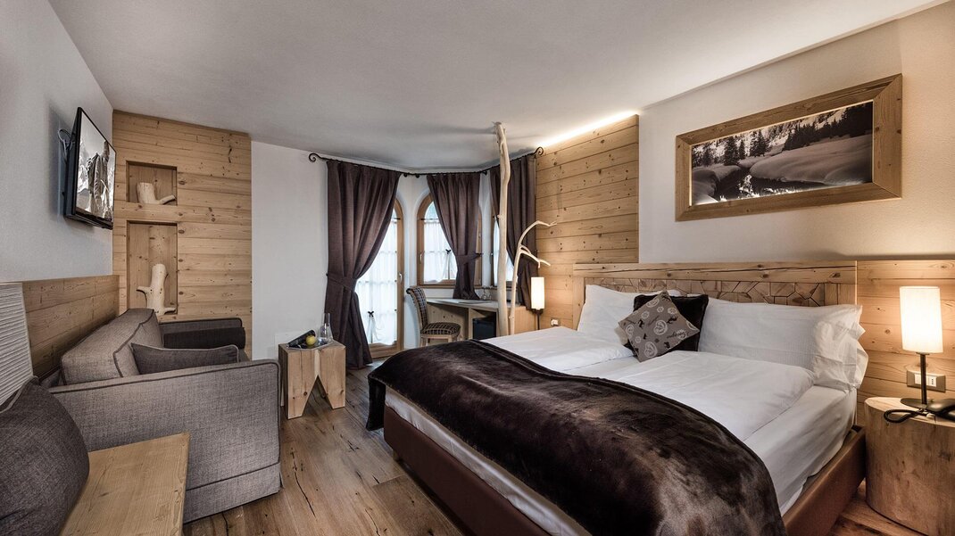 Cozy atmospheres in classic alpine style, almost all with balcony and shower cabin with hydromassage, towel warmer, custom underfloor heating, 32” LCD screen, SKY TV, Wi-Fi Internet, reading corner, SPA Kit (for adults), minibar, hairdryer, telephone, electronic safe (also for PC) and complimentary toiletries. Suitable for up to 2 people, and measure from 20 to 26 sqm.