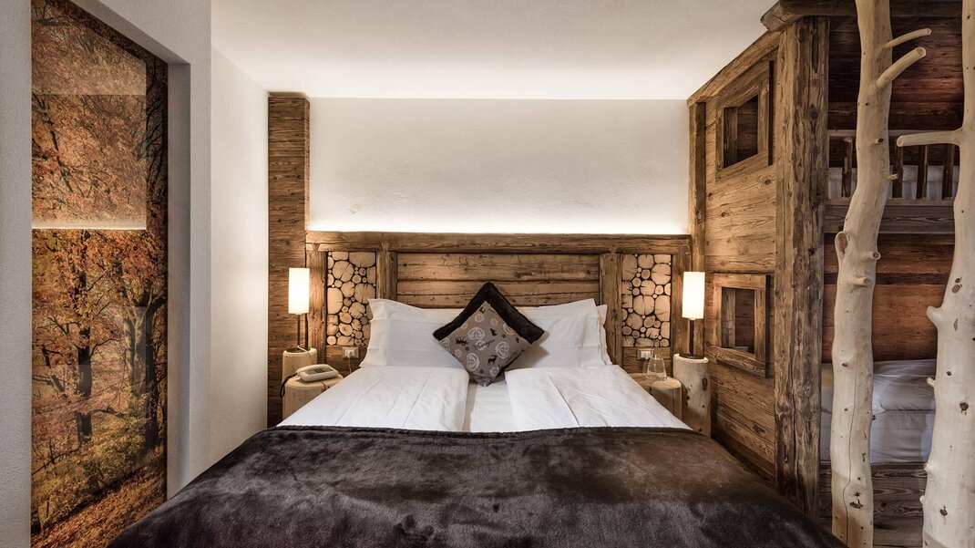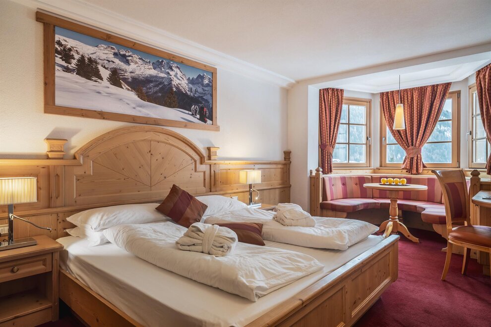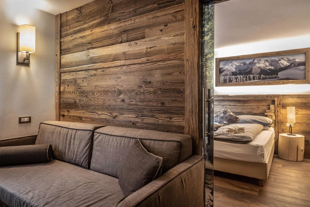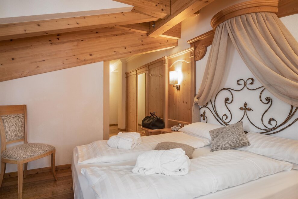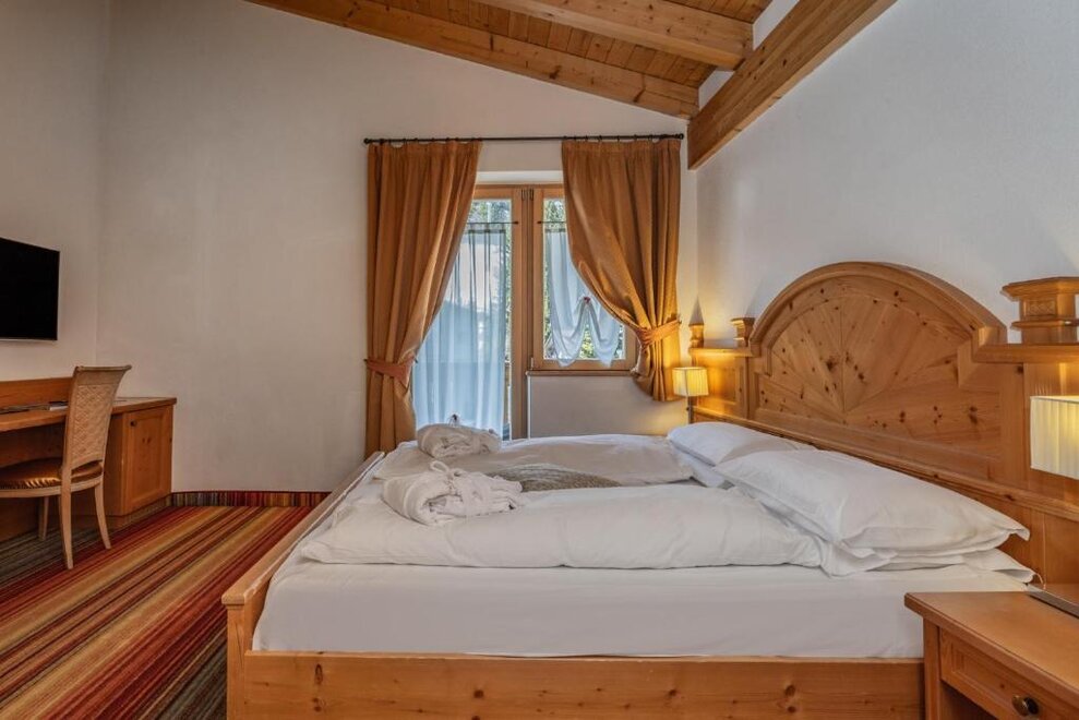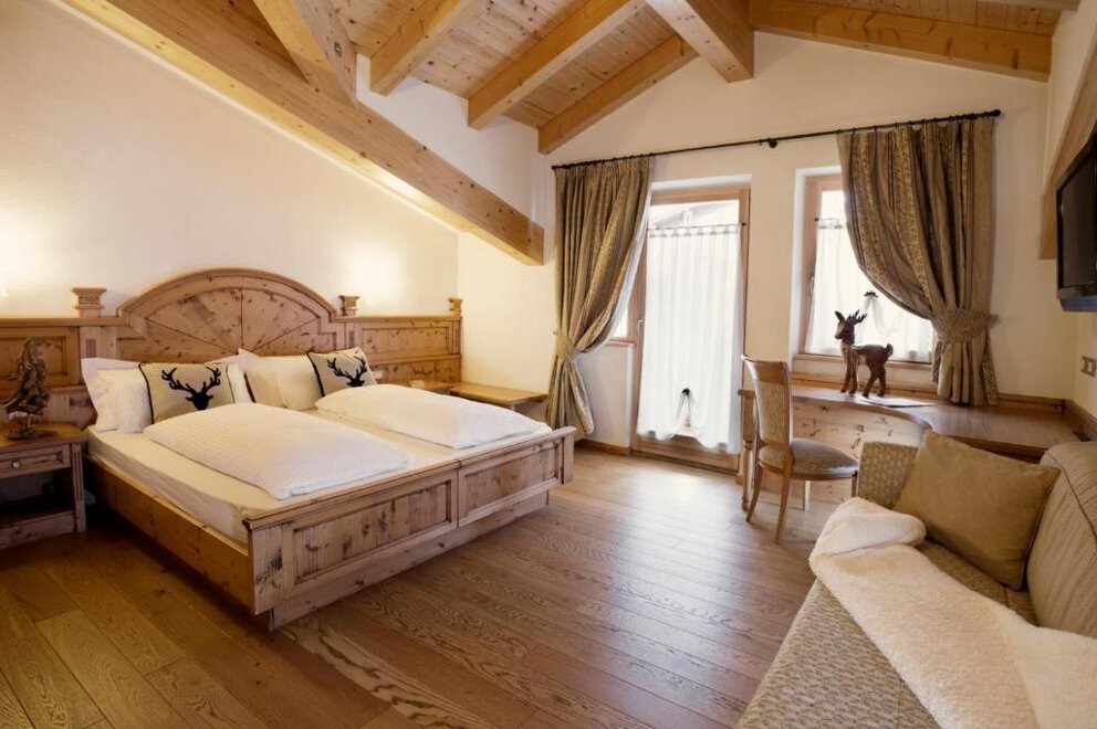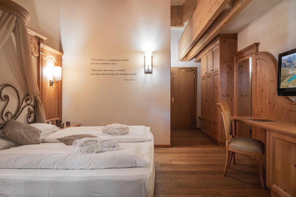 Cozy atmospheres in classic alpine style, almost all with balcony and shower cabin with hydromassage, towel warmer, custom underfloor heating, 32” LCD screen, SKY TV, Wi-Fi Internet, reading corner, SPA Kit (for adults), minibar, hairdryer, telephone, electronic safe (also for PC) and complimentary toiletries. Suitable for up to 2 people, and measure from 20 to 26 sqm.