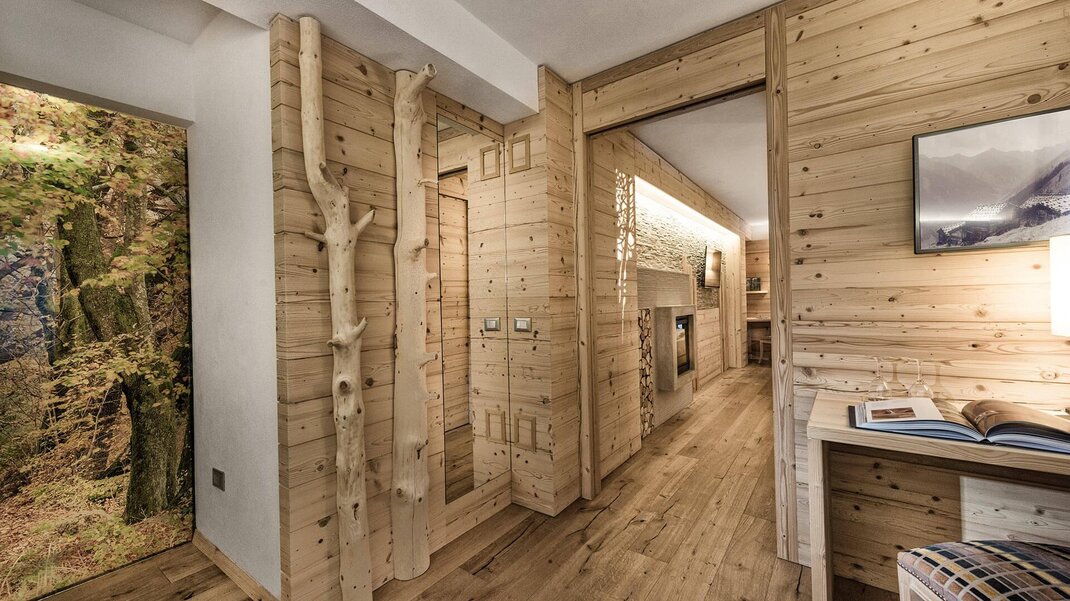 Contemporary alpine style with natural woods and essential details. Fireplace and private balcony for moments of intimacy, parquet flooring and modern comforts for a practical and relaxing stay. Ideal for two people.