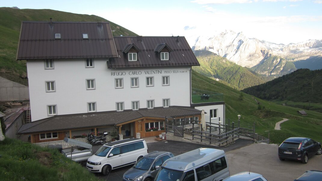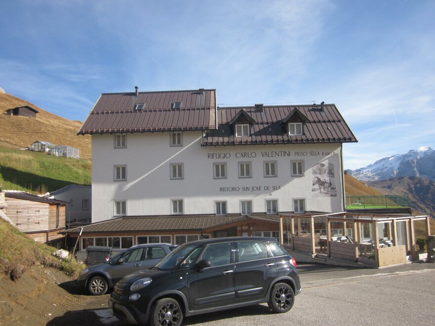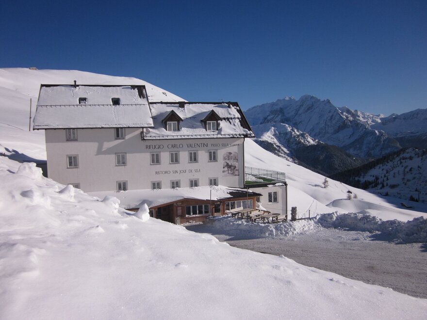 The Rifugio Valentini was built in 1884 on the old Passo Sella road (a little lower than the current road) and accommodated mostly traders on their way between the Valle di Fassa and Valle Gardena. Then came the era of tourism in the Dolomites and the refuge - now in its fourth generation - is these days bustling with walkers and climbers with their sights on the rock faces of Sella and Sassolungo, and with skiers who come here in winter to enjoy the pistes of the Sella Ronda. Inside the refuge (which is right on the ski slopes, but is also accessible by car a short distance from Passo Sella) there is also a small indoor climbing wall. Open From mid-June to late September From early December to early April Before leaving for your hike, always contact the manager to verify the actual opening of the mountain hut Walks The Rifugio Valentini can be a starting point for the Giro del Sassolungo (5 hours, difficulty E), a circular route passing the Salei, Friedrich August, Pertini, Sassopiatto and Vicenza refuges. The Rifugio Vicenza can also be reached via Forcella Sassolungo (also accessible by cable car) in 2 ½ hours (difficulty E). This refuge is also a starting point for walks in the Sella Group.